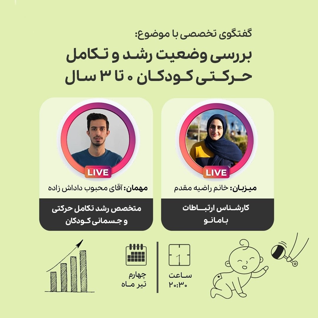 . یکی از اولین و اصلی ترین دغدغه های هر پدر و مادری اینه که بدونن آیا کوچولوشون رشد خوبی داره؟ و مراحل تکاملش رو به موقع و درست طی میکنه یا نه؟ خصوصا که معمولا کوچولوها با هم مقایسه می شن و ممکنه این تفاوت های رشدی تکاملی باعث نگرانی بشه. به همین دلیل بامانو لایوی ترتیب داده با موضوع: ⭐ بررسی وضعیت رشد و تکامل حرکتی کودکان ۰ تا ۳ سال ⭐ در این لایو به موضوعات زیر خواهیم پرداخت: 👇🏻 - مراحل تکامل و نقاط عطف رشدی کودک از تولد تا ۳ سالگی چه چیزهاییه؟ - آیا باید در روند تکاملی کودک دخالت و کمک کنیم یا کودک رو رها کنیم که خودش به نقطه عطف رشدی دست پیدا کنه؟ - اگر کودکمون در انجام دادن برخی نقاط عطف تاخیر داشت نشون دهنده مشکل در رشدشه؟ - ما پدر و مادر ها چه فعالیت هایی با کودکمون انجام بدیم که به رشد و تکامل کودک کمک کنه؟ - چه عواملی ممکنه برای رشد و تکامل کودک، بازدارنده باشه و باعث تاخیر رشدی کودک بشه؟ ⭐ به میزبانی: خانم راضیه مقدم (کارشناس ارتباطات بامانو) ⭐ با حضور: آقای محبوب داداش زاده (متخصص رشد تکامل حرکتی و جسمانی کودکان ) تاریخ برگزاری: شنبه ۴ تیرماه - ساعت ۲۰:۳۰ 🕣 در صفحه اینستاگرام بامانو این لایو رو دنبال کنید! 😉