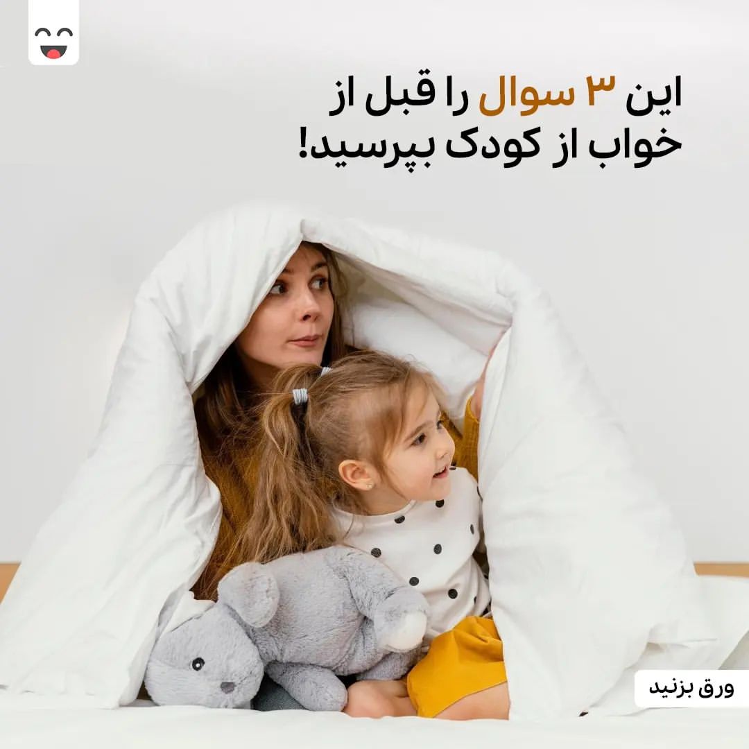 ⁉️ این ۳ سوال رو شب ها قبل از خواب از کوچولوتون بپرسین: 💫 1️⃣ يه چيز رو بگو كه امروز باعث شد بخندی یا لبخند بزنی؟ 😊 2️⃣ يه چيز رو بگو كه باعث شد امروز گريه كنی؟ 😢 3️⃣ يه چيز رو بگو كه امروز ياد گرفتی يا فهميدی؟🤔 ✅ جواب شماره ۱ كمک میکنه کودک دعا كردن رو ياد بگیره و با هم خدا رو شكر میکنین. ✅ جواب شماره ٢ به کودک ما ياد میده بدی ها و ناراحتی ها بالاخره تموم میشن و آرامش باز برمیگرده. پس نگران نباش و اميدوار باش. ✅ جواب شماره ٣ باعث میشه کودک تمام عمر به دنبال ياد گرفتن و فهميدن باشه و به اين كه چيزی میدونه افتخار كنه. همه اين ارتباط باعث میشه که کودک ما عادت کنه با ما صحبت کنه و مشكلاتی که در سنین بالاتر داره با ما در ميون بذاره. این رفتار موجب میشه که ما هم بيشتر كودكمون رو بشناسيم و اگر در طول روز سوء تفاهمی بینمون پيش اومده و يا اشتباهی در ارتباط با کودک انجام دادیم متوجه بشیم و به طور كلی، با فرزندمون لحظات خوبی رو قبل از خواب بگذرونیم. 😊 مجله بامانو پر از مطالب روانشناسی و فرزند پروریه! کافیه از لینک بیو بامانو رو دانلود و نصب کنی 😎 #بامانو #مجله #مجله_بامانو #روانشناسی #فرزندپروری #فرزند_پروری #روانشناسی_کودک #خواب #مادر #بچه #کودک #فرزند #خانواده #پرورش_کودک #نینی