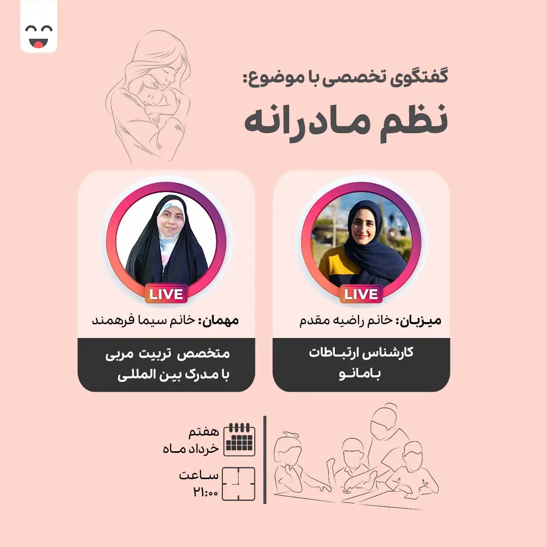 . اهمیت نظم و برنامه ریزی تو دنیای امروز، انکارناپذیره. حالا اگر مامان و همسر باشی یا در کنارش شاغل هم باشی و مدیریت زمانت روی کیفیت زندگی همه خانواده تاثیر بذاره، اهمیتش دو چندان میشه! امروز در بامانو لایوی برگزار میکنیم با موضوع: ⭐ نظم مادرانه ⭐ در این لایو به این سوالات پاسخ میدیم: - اهمیت نظم برای مادرها و تاثیرش بر خود، فرزندان و خانواده - برای مدیریت زمان و نظم از کجا شروع کنیم؟ - چجوری برای زندگی هدف گذاری کنیم که به همه نقش هامون به صورت متعادل بپردازیم؟ - موانع پیش روی نظم مادرانه چه چیزاییه؟ - و چگونگی مدیریت فرزندان به عنوان بزرگترین چالش در نظم مادرانه ⭐ به میزبانی: خانم راضیه مقدم (کارشناس ارتباطات بامانو) ⭐ با حضور: خانوم سیما فرهمند (متخصص تربیت مربی با مدرک بین المللی) تاریخ برگزاری: ۷ خرداد - ساعت ۲۱:۰۰ 🕘 @donyae.koodaki مادرای گل این لایو رو از دست ندین 🙋🏻♀️ #بامانو #لایو #دنیای_کودکی #کودک #مادر #نظم #نظم_کودک #نظم_مادرانه #مادرانه #فرزند #بچه #خانواده