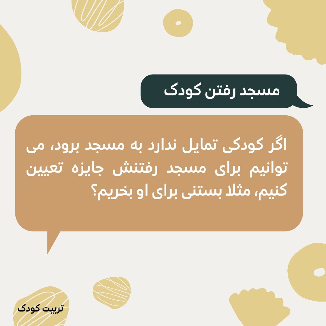 پدر و مادر می توانند #مسجد رفتن را با یک #خرید لذت بخش همراه کنند اما نباید کودک را به مورد خاصی شرطی نمود. این اشکال ندارد و بلکه لازم است کودکان بدانند که بعد از مسجد همیشه اتفاق جالبی برای آنها می افتد ولی سعی کنند این اتفاق روی جریان خاصی مانند #بستنی خریدن متمرکز نشود. می توان یک بار گفت "بچه ها ما به مسجد می رویم بعد از آن بستنی می خریم، چه کسی با ما می آید؟" و بار دیگر گفت "بچه ها ما به مسجد می رویم و بعد از آن #پارک می رویم؟" یا "بچه ها دوست دارید بعد از مسجد، برویم منزل #مادربزرگ؟" و دفعاتی را نیز می توان با چیزی همراه نکرد. اگر کودک والدین خود را دوست داشته باشد معمولا دست رد به سینه شان نمی زند. باید دانست که بچه هایی که زیاد شرطی شوند، #انگیزه درونی خود را از دست می دهند و این موضوع در سال های بعد به شکل #توقع در آنها باقی خواهد ماند. #تربیت_کودک #پرسش_و_پاسخ