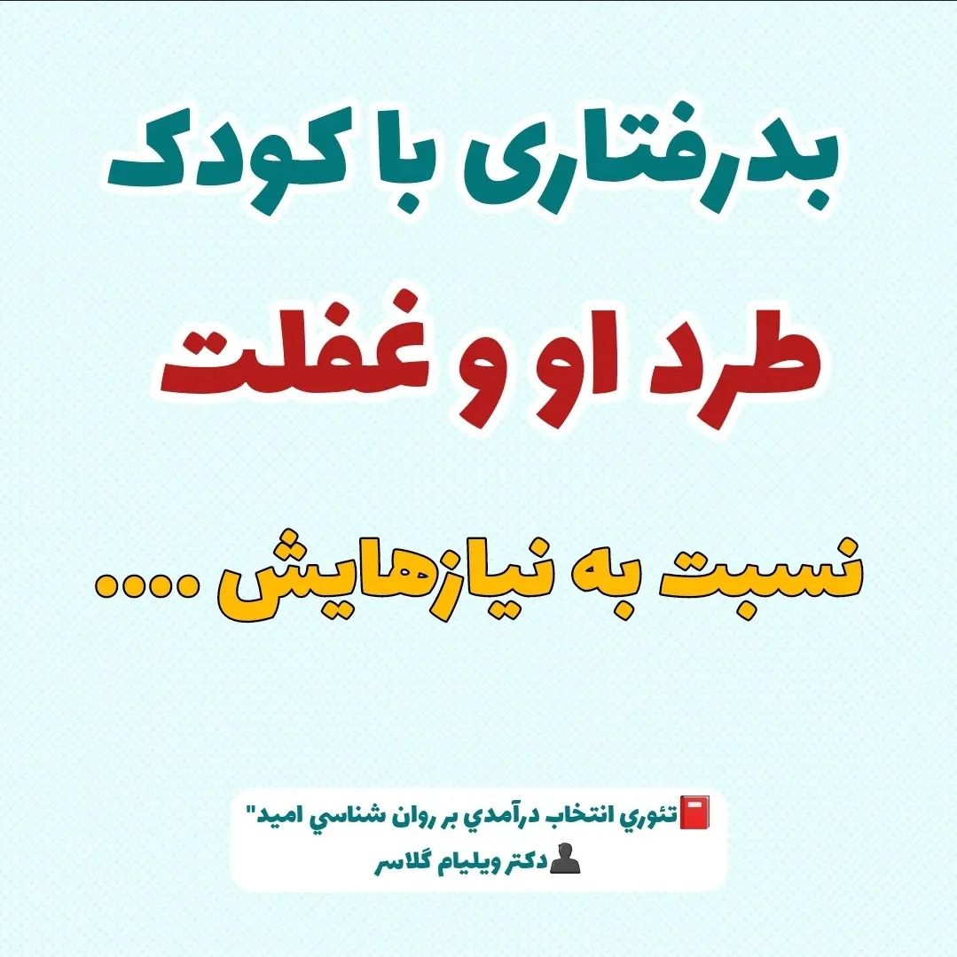 بدرفتاری با کودک ، طرد او و غفلت نسبت به نیازهایش اگر چه بسیار فراگیر است ولی دلیل اصلی ناخرسندی خانواده ها نیست. بخش اعظمی از ناخشنودی خانواده ها ناشی از کوشش والدین به وادار ساختن کودکان به کاری است که مایل به انجامش نیستند. نیت والدین غالباً خیر است، ولی کودکان ، به ویژه آنهایی که کمی بزرگ تر هستند ، برای دستیابی به آزادی شخصی در برابر تلاش های والدین خود مقاومت می کنند. سال ها بعد این اختلاف و تعارض دوباره به گونه ای دیگر پدیدار می شود و آن زمانی است که کودکان دیروز ، پدر و مادر سالخوردۀ خود را به کارهایی وادار می کنند که والدین دوست ندارند انجام بدهند. گزیده_کتاب 📕تئوري انتخاب درآمدي بر روان شناسي اميد" 👤دکتر ويليام گلاسر #رشد_تکامل_کودک #رفتار_با_کودک#رفتار_با_کودک_و_نوجوان#رشد_کودکان#داداشزاده#محبوب_داداشزاده #آگاهی_والدین_سلامت_کودکان #آگاهی_مادرانه#والد_آگاه#بامانو#تربیت_کودک