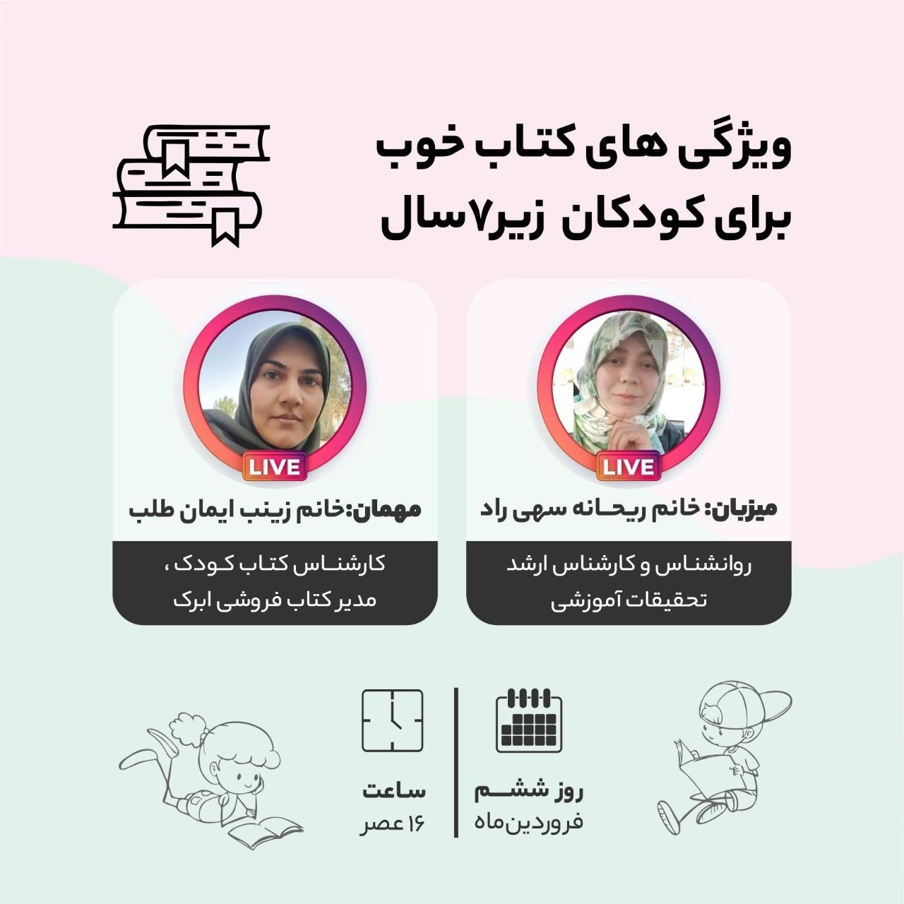 همه ما کم و بیش با اهمیت کتابخونی و انس با کتاب در کودک آشنا هستیم، اما دغدغه اغلب ما اینه که کتاب مناسب برای سن کودکمون چه کتابیه و بر چه اساسی انتخابش کنیم! 📚 در همین خصوص بامانو در صفحه اینستاگرامش لایوی برگزار میکنه با موضوع: 🔅 ویژگی های کتاب خوب برای کودک زیر ۷ سال 🔅 ⭐ با میزبانی: خانم ریحانه سهی راد (روانشناس و کارشناس ارشد تحقیقات آموزشی) ⭐ و با حضور : خانم زینب ایمان طلب (کارشناس کتاب کودک، مدیر کتابفروشی ابرک) تاریخ برگزاری : ۱۴۰۱/۱/۶ - ساعت ۱۶ 🕓 در صفحه اینستاگرام بامانو &@Bamano.life&:https://www.instagram.com/p/CbhxLFWgAtL/?utm_medium=copy_link با ما همراه باشین 😉