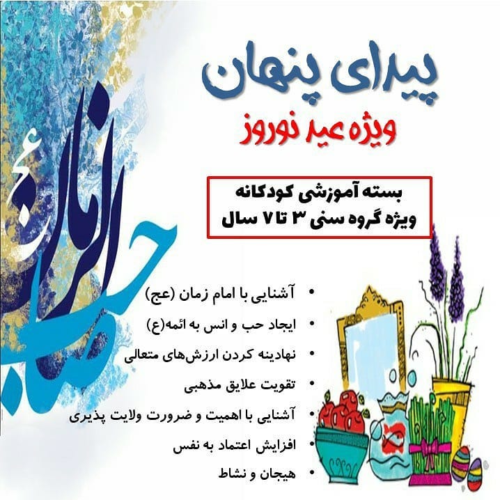 . 📌بسته آموزشی 🌿پیدای پنهان ویژهی نوروز🌿 بسته آموزشی « پیدای پنهان» توسط مجموعه مثبت والدگری تهیه و تولید شده است. 🎯در این بسته آموزشی مولفههای اصلی مهدویت : ولایت،غیبت،انتظار، دعا و ظهور برای کودکان عینی سازی شده و آنها میتوانند به شیوه غیر مستقیم و در قالب فعالیتهای شاد و هدفمند با این مولفه ها آشنا شوند. این بسته آموزشی ویژه کودکان 3 تا 7 سال و با هدف آشنایی با امام زمان (عج) ، ایجاد حب و انس به ائمه(ع)، نهادینه کردن ارزشهای متعالی، تقویت علایق مذهبی، آشنایی با اهمیت و ضرورت ولایت پذیری ، افزایش اعتماد به نفس و... طراحی شده است. این بسته حاوی کارت های ویژه کودکان،کارتهای ویژه والدین،اهداف و شرح کلیه فعالیتها و کلیه لوازم مورد نیاز میباشد.هدیه این بسته: 85 هزار تومان میباشد. 🕪🎉🔊بسته آموزشی 🌿« پیدای پنهان ویژه عید نوروز»🌿 علاوه بر موارد فوق حاوی وسایل ویژه تدارک سفره هفت سین : گواش 12 رنگ، قلمو و کاردک، نمد سفره هفت سین و وسایل دوخت، ظروف سفالی و تخم مرغ عروسک های پدر یزرگ و مادر یزرک و عمو نوروز، وسایل مورد نیازدرست کردن گاو و...میباشد. 📮هدیه این بسته 175 تومان است. 🎁همه بسته ها شامل هدیه ویژه ای برای مهدیاران میباشد.