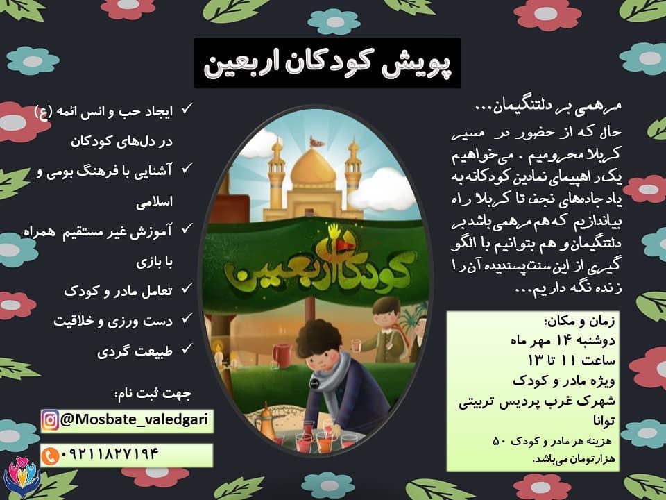 قدم قدم پای علم....🏴 ان شاالله اربعین میام سمت حرم😭😭😭 ما هدفمون اینه که سنت های بزرگ مذهبی را به کودکانمان بیاموزیم✔....امسال که نمی شود با کودکانمان در جاده های اربعین باشیم😢...با رعایت تمام پروتکلهای بهداشتی👌....به صورت نمادین و با هدف ایجاد یک خاطره خوش از این روز در ذهن کودکانمان مراسم اربعین ابا عبداالله رو پر شور و شعور در کنار هم برگزار میکنیم.💚 ان شاالله که دل امام زمانمان(عج) از ما راضی باشد⚘ جهت کسب اطلاعات بیشتر تماس با ۰۹۲۱۱۸۲۷۱۹۴ یا دایرکت به @mosbate_valedgari #مثبت_والدگری #مثبت #والدگری #والد #کودک #تربیت_اسلامی #تربیت_کودک #تعلیم_و_تربیت_اسلامی #اربعین #محرم #صفر #امام_حسین (ع) #امام_زمان (عج)#پویش_اربعین#کودک_اربعین
