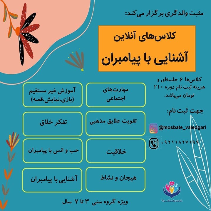 کلاسهای آنلاین آشنایی با پیامبران،ویژه کودکان ۳ تا ۸ سال توسط مجموعه مثبت والدگری برگزار میشود. این دوره از کلاس ها با هدف آشنایی کودکان با پیامبران،افزایش علایق مذهبی،نشاط و هیجان،افزایش مهارتهای اجتماعی و... برگزار میشود. جهت ثبت نام دایرکت به: @mosbate_valedgari تماس با: ۰۹۲۱۱۸۲۷۱۹۴ #کودک_اسلامی #کلاس_اسلامی_کودک #کلاس_اسلامی #آشنایی_پیامبران #مثبت_والدگری # تربیت_اسلامی_کودک