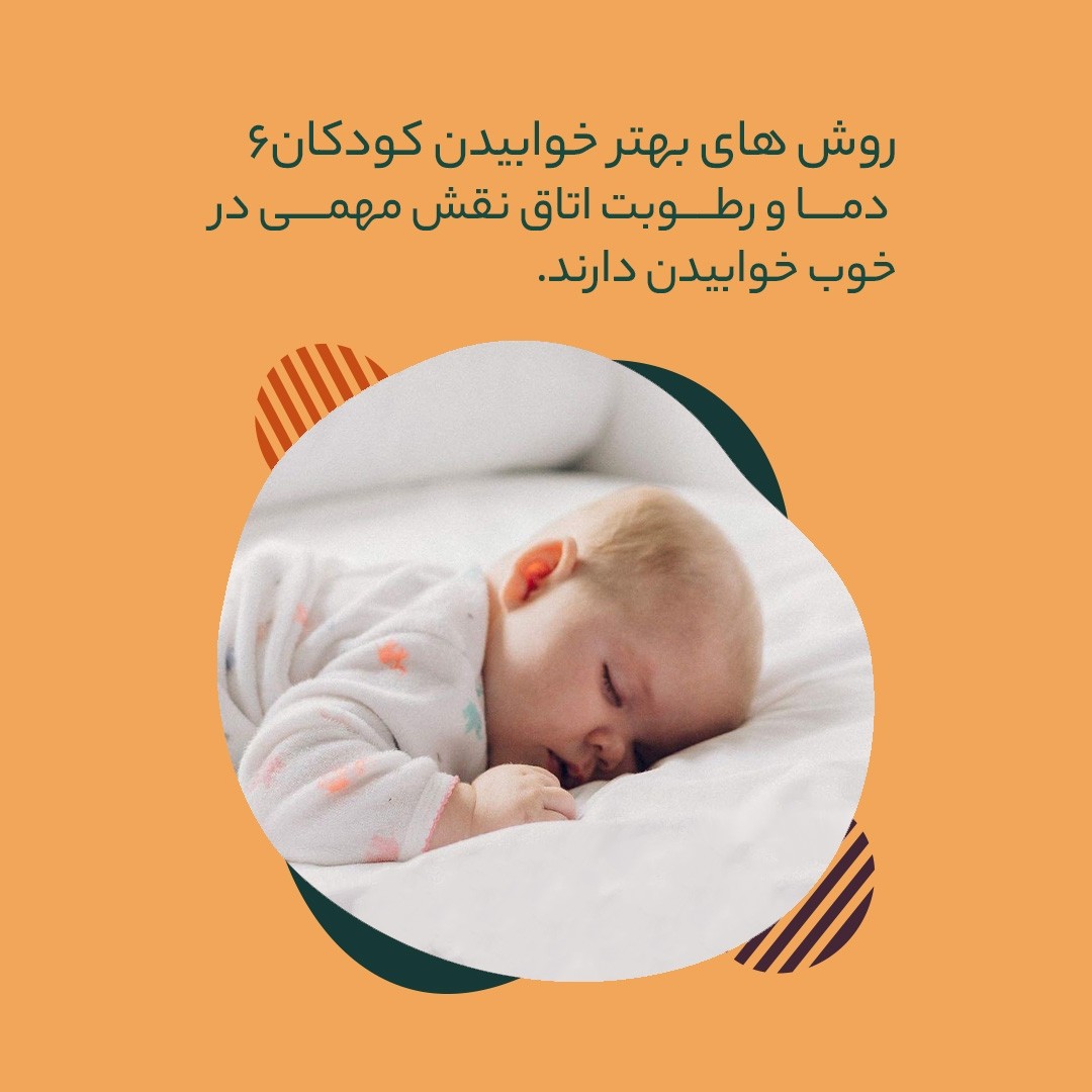 . #دما و #رطوبت اتاق نقش مهمی در خوب خوابيدن دارند. در #زمستان ها #اتاق_خواب بچه ها را بيش از حد #گرم و هواي آن را خيلي #خشك نكنيد. چند ساعت قبل از #خواب، شوفاژ يا بخاري را خاموش و هواي اتاق را تهويه كنيد. دماي اتاق در طول زمان خواب نبايد از 18 درجه سانتيگراد تجاوز كند. در طول شب نيز به اندازه كافي به فكر تهويه هواي اتاق باشيد. گوشه پنجره يا در اتاق را باز بگذاريد كه هميشه هواي تازه در داخل جريان داشته باشد. همچنين در مواقع فوري قرار دادن دستمال مرطوبي روي شوفاژ يا كتري آب روي بخاري نيز به از بين بردن سريع خشكي #هوا كمك مي كند.