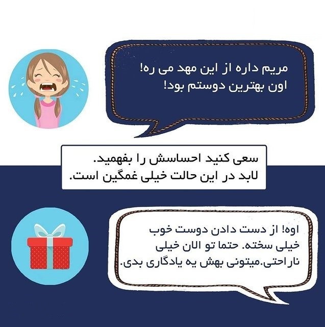 . مهم است بدانید در هر موقعیتی او چه احساسی ممکن است داشته باشد و بتوانید آن را برایش توضیح دهید. علاوه بر شرح احساسش، می توانید به او #راهکار هایی بدهید تا #احساس بهتری پیدا کند. مثلا پیشنهاد دهید شرایط را جور دیگری که به نظرش بهتر بود توصیف کند.
