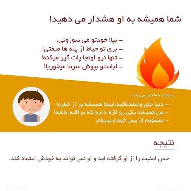 . این کاملا طبیعی است که شما نگران فرزندتان باشید و لازم باشد به او توصیه هایی کنید. اما یادتان باشد هشدارهای همیشگی شما سر هر مساله ای اولا باعث می شود کم کم این هشدارها عادی شود و اثر مطلوب خود را در جای لازم از دست بدهد، دوما موجب می شود کودتان احساس #ناامنی کند و #ترس یار همیشگی اش شود و سوما، با این کار شما کسی می شوید که همواره در حال گوشزد کردن است و خب، اینجور آدم ها حوصله همه را سر می برند.