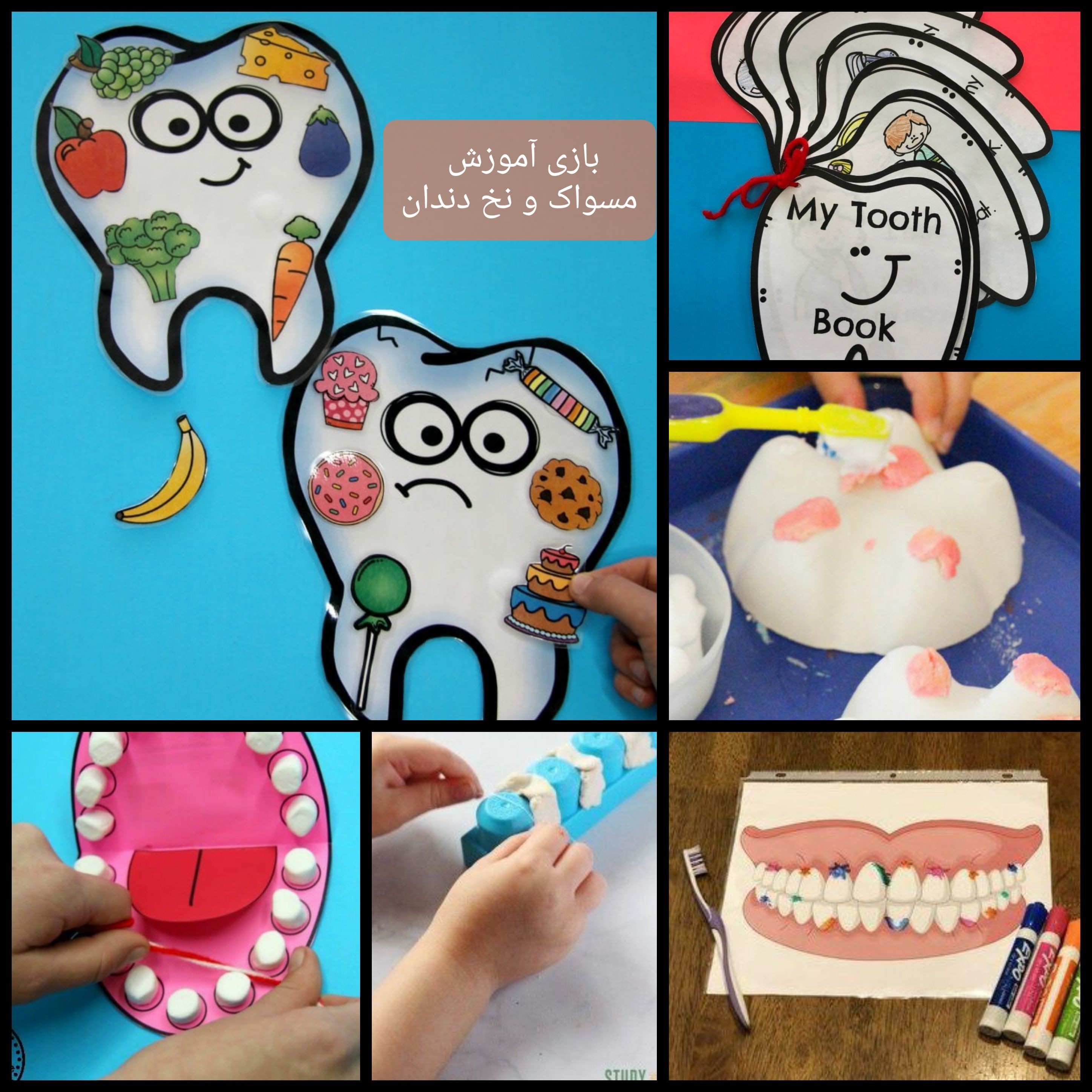بازی آموزش مسواک و نخ دندان #بازی_هدفمند عادت به مسواک و نخ دندون، از جمله رفتارهاییه که باید در کودک شکل بگیره. بهترین شیوه آموزشش، الگوگیری از رفتار والدینه، ولی اگر همراه با بازی بشه، چند برابر تاثیرگذار خواهد بود. ۱. مسابقه کی بهتر مسواک میزنه؟ تا حدود ۶ سالگی، مسئولیت بهداشت دهان و دندان کودک برعهده ماست چون مهارت دست کودک هنوز کافی نیست. این بازی کمک میکنه هم کودک مستقلا مسواک زدن رو تمرین کنه، هم ما به طور نامحسوس، خوب و کافی براش مسواک بزنیم. اول یک بار هرکی برای خودش مسواک میزنه. بار دوم جلوی کودک میشینیم و کودک برای ما و ما برای کودک مسواک میزنیم. بچه ها خیلی کیف میکنن مخصوصا اگر وقتی برامون مسواک میزنه کلی ادا و شکلک دربیاریم. ۲. با مقوا و انواع وسایل مثل لگوهای ریز یا لوبیای سفید و ... میتونیم یه مولاژ دهان و دندان درست کنیم. میتونیم با ماژیک وایت برد روی دندون ها، لکه های سیاه بکشیم و کودک با مسواک ، دندون ها رو تمیز کنه. یا نخ دندون کشیدن رو باهاش تمرین کنه ۳. یک عکس دهان و دندون رو پرینت میگیریم و داخل کاور برگه کاغذ میگذاریم. با ماژیک وایت برد، روی دندون ها ، لکه های سیاه میکشیم و از کودک میخوایم با مسواک تمیزشون کنه. ۴. با کمک خود کودک، یک کتاب در مورد بهداشت دهان و دندان درست کنیم. اگر شخصیت اصلی قصه، خود کودک باشه، هم جذابیت ش بیشتره و هم تاثیرگذاریش. بذاریم قصه ش رو خودش بسازه و نقاشی ش رو خودش بکشه.. ۵. با مقوای رنگی، دو تا دندون ناراحت و خوشحال و انواع خوراکی های مفید و مضر برای دندون ها رو درست کنیم و از کودک بخوایم خوراکی های مفید رو روی دندون خوشحال و خوراکی های مضر رو روی دندون غمگین بذاره. ۶. لای دندونه های یه لگوی بزرگ چندتایی، خمیرِ بازی بچسبونیم (در نقش مواد غذایی گیر کرده لای دندون ها) و از کودک بخوایم با نخ دندون، خمیرها رو دربیاره و دندون ها رو تمیز کنه. ۷. قسمت انتهایی بطری نوشیدنی رو جدا میکنیم (شبیه دندونه 😉) و خمیرِ بازی رو، روش میچسبونیم. (در نقش مواد غذایی) و کودک با مسواک باید تمیزشون کنه. شما چه بازی هایی به ذهنتون میرسه؟
