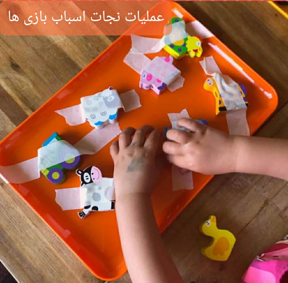 عملیات نجات اسباب بازی ها گروه سنی: ۱تا ۲ سال #هماهنگی_چشم_ودست #تقویت_حرکات_ظریف #تقویت_مهارت_حل_مسئله #تقویت_کلام ابزار لازم: چسب کاغذی(یا فویل)، اسباب بازی های کوچک، سینی یه بازی بسیار ساده و سرگرم کننده برای این سن. اسباب بازی ها رو با چسب روی سینی میچسبونیم و کوچولومون باید اون ها رو نجات بده. اگر چسب نداریم ، میتونیم اسباب بازی ها رو لای فویل قایم کنیم. برای تقویت کلام کودک، میتونیم بازی رو با قصه در مورد عملیات نجات همراه کنیم، یا اینکه هر اسباب بازی که آزاد کرد، در مورد اسم و رنگ و شکل و ... با کودک صحبت کنیم. با کمترین وسایل ، بهترین بازی ها رو میشه انجام داد😉