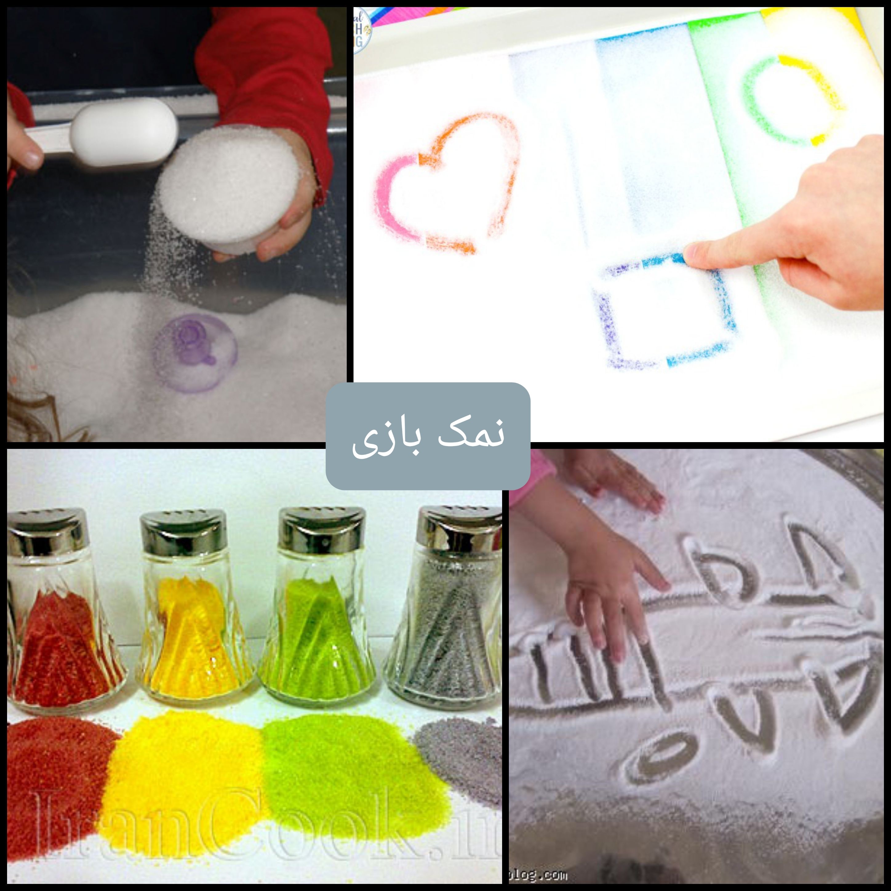 نام بازی: نمک بازی #بازی_ابزاری #بازی_حسی گروه سنی: ۱ تا ۳ سال وسایل مورد نیاز: نمک- ظرف-قاشق –نمکدون-اسباب بازی های کوچک- ماشین کوچیک، تخم مرغ، قیف مراحل بازی: ۱) ابتدا نمک رو در اختیار بچه ها میذاریم تا باهاش بازی کنن و با جنسش آشنا بشن. مقداری نمک رو تو مشتشون بگیرن و ببینن که از لای انگشت هاشون بیرون میریزه. مقداریش رو زبون بزنن و مزه کنن. توضیح میدیم که این مزه شوری نام داره. ۲) بعد از مدتی تعدادی اسباب بازی کوچیک به بچه ها میدیم تا اون ها رو زیر نمک ها پنهان کنن و دوباره پیداشون کنن. ۳) حالا ظرف و قاشق در اختیار بچه ها قرار میدیم تا با قاشق از این ظرف به اون ظرف نمک بریزن. ۴) ظرف در اختیار بچه ها رو مدام کوچکتر می کنیم و از بچه ها می خوایم تلاش کنند بدون اینکه نمکی روی زمین بریزه ظرف هاشون رو پر کنند . تو این بازی بچه ها تمرین تمرکز می کنند. در آخر به هر کدوم از بچه ها یک نمکدون میدیم تا اون رو با نمک پر کنند. ۵) در مرحله بعد قیف در اختیار بچه ها میگذاریم تا هم باهاش آشنا بشن و هم نمکدون ها رو اینبار با قیف پر کنن. (میتونیم با کاغذ قیف درست کنیم که خلاقانه تر و آموزنده تر هم باشه) ۶) تو سینی نمک میریزیم و بچه ها هر کدوم یه ماشین دارن و ماشین هاشون رو تو جاده نمکی می برن. ۷) حالا با انگشت روی نمک ها نقاشی بکشن( اگر کف سینی رنگی باشه یا یک کاغذ رنگی زیر نمک ها بذاریم، نقاشی بهتر خودش رو نشون میده) ۸) به بچه ها نی میدیم تا با فوت کردن روی نمک ها شکل ایجاد کنن. ۹) یک تخم مرغ رو به بچه ها میدیم و ازشون میخوایم ایستادنش رو، رو زمین و رو نمک باهم مقایسه کنن. ۱۰) در نهایت هم به هر کدوم از بچه ها یک کاغذ رنگی میدیم تا با نمکدون روش نمک بریزن. هم مشاهده سفید شدن کاعذ برای بچه ها جذابه و هم صدایی که پاشیدن نمک ایجاد می کنه. (طرز تهیه نمک رنگی: مقداری نمک را داخل کاسه ای میریزیم. چند قطره رنگ خوراکی (یا رنگ طبیعی مثل آب سبزی، آب آلبالو، آب کلم قرمز و ...) ، روی نمک ها می چکانیم (مقدارش بسیار کم باشه که نمک حل نشه) و سریع آن ها را مخلوط میکنیم تا نمک ها رنگی بشن. بعد نمک رنگ شده را داخل سینی می ریزیم و پخش میکنیم و روی حرارت بسیار کم ( مانند حرارت بخاری ) چند لحظه هم میزنیم تا نم نمک ها گرفته بشه. نمک رنگی مون آماده است.)