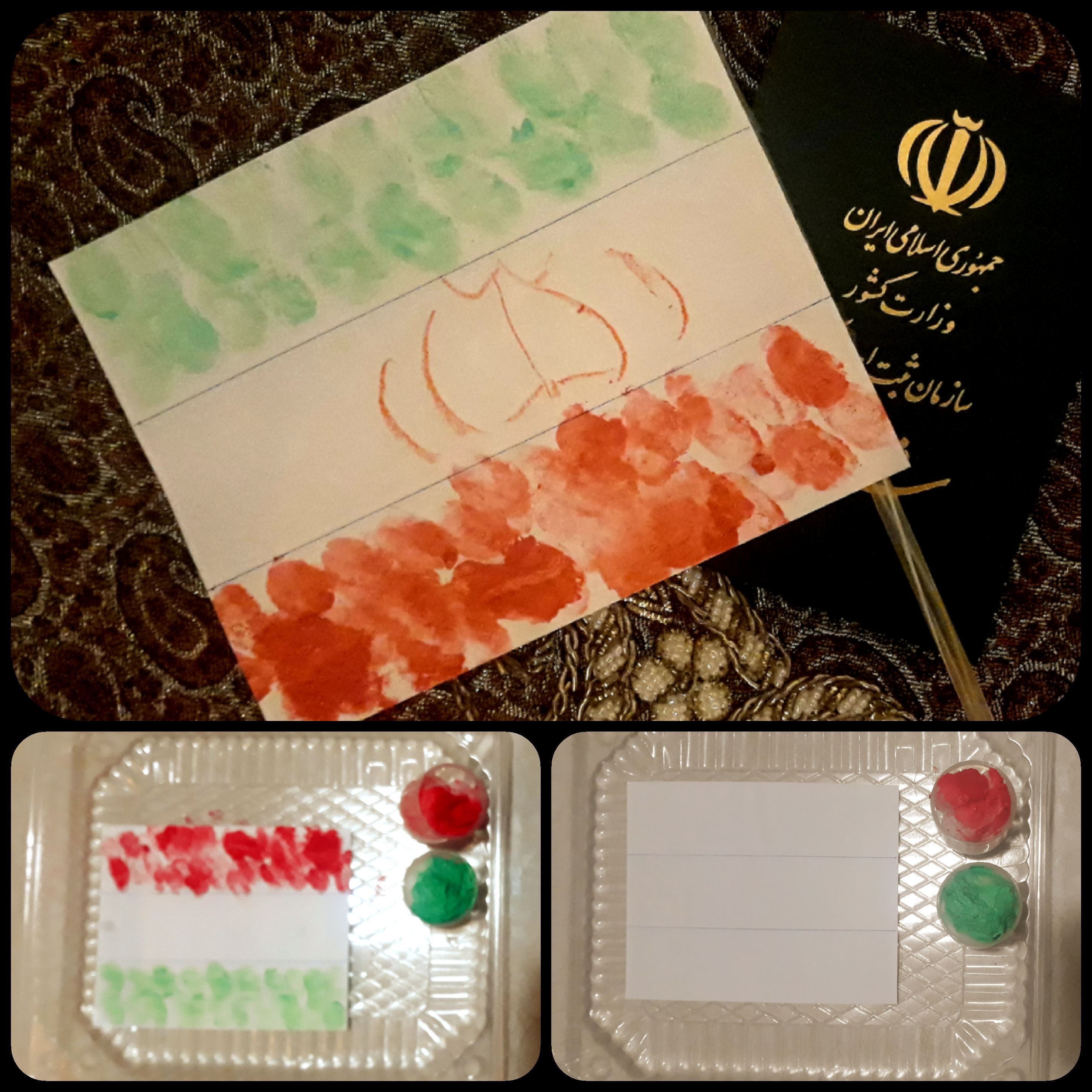 پرچم ایران #کاردستی #مهارت_دست_ورزی ابزار لازم: کاغذ، رنگ انگشتی، پنبه یا ابر، نی پنبه ها رو دو قسمت میکنیم و کمی مرطوب میکنیم و به دو رنگ سبز و قرمز آغشته میکنیم. اینجوری یک استامپ ساختیم. حالا با رنگی کردن انگشتمون، قسمت های پرچم رو رنگ میکنیم. اگر انگشتمون رو کمتر به رنگ آغشته کنیم، اثر انگشتمون هم روی کاغذ معلوم میشه. و میتونیم اثر انگشت خودمون رو با کودک مقایسه کنیم و باهاش در مورد اون و اینکه در هر فردی اختصاصی هست، صحبت کنیم. با چسبوندن یک نی، پرچممون کامل میشه. 🤗😍