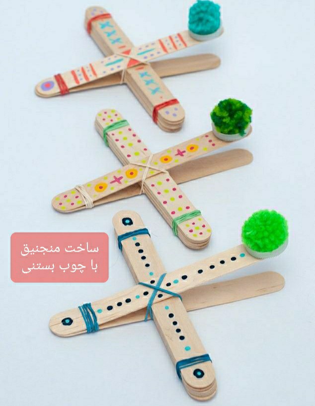 (ورق بزنین) ساخت منجنیق با چوب بستنی #تقویت_تمرکز #کاردستی_بازی #تقویت_دست_ورزی #تقویت_هماهنگی_چشم_ودست ابزار لازم: تعدادی چوب بستنی، کش، در بطری یا قاشق یک بار مصرف ساختش فوق العاده ساده ست. ۱. خود پرتاب کردن اشیا ریز برای بچه ها جذابه. میشه مسابقه بدیم کدوم بلندتر و دورتر پرتاب میکنه. ۲. میشه پرتاب رو هدفمند کرد. یه سبد رو با فاصله بذاریم و سعی کنن توپ ها رو داخل سبد بندازن. یا چند سبد رو با فاصله های مختلف قرار بدیم . سبد ها براساس فاصله شون امتیاز دارن. مثلا سبد دورتر ۲۰ امتیاز و به همین ترتیب سبدهای نزدیک تر امتیاز کمتر دارن. حالا به هرکس تعدادی توپ داده میشه و مجموع امتیازها ، برنده رو مشخص میکنه. ۳. برای بچه های بزرگتر، میشه سبد ها رو با رنگ ها، نشونه گذاری کرد و کودک باید نشونه گیری کنه و هر توپ رو در سبد همرنگ خودش بندازه. ۴. میشه شبیه بازی انگری بردز هم باهاش انجام داد😬. مثلا با چوب های جنگا یا لیوان یک بار مصرف، یه سازه بسازیم و با توپ ها سعی کنیم خرابش کنیم. و بازی های خلاقانه دیگه...😉