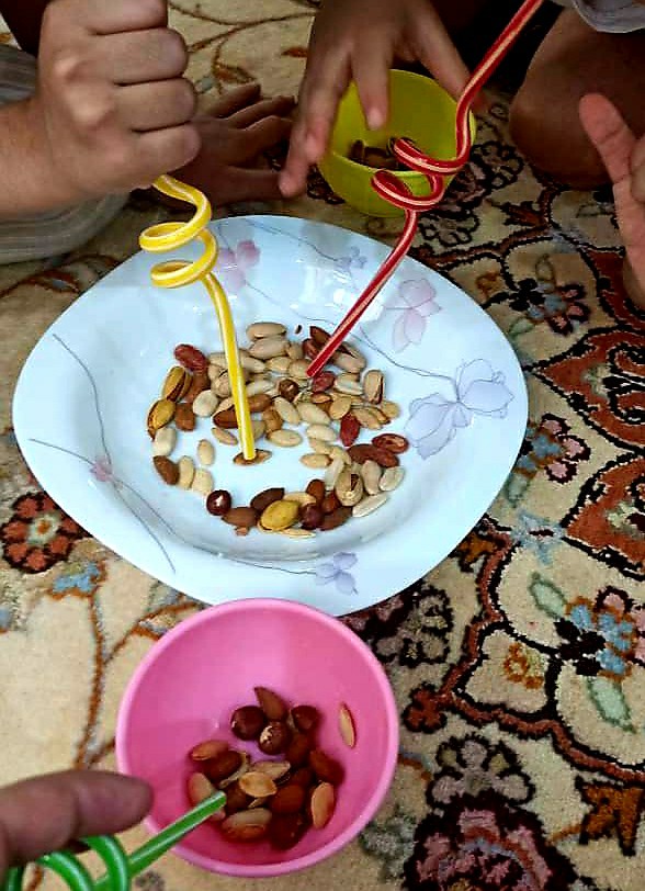 گروه سنی: ۳ سال به بالا #افزایش_تمرکز #بازی_هیجانی #بازی_دونفره مقداری آجیل تو ظرف میریزیم و به هر کودک یک نی میدیم. بچه ها باید با مکش، آجیل ها رو به ظرف خودشون منتقل کنن. میشه براساس سنگینی و سختی جابجایی، برای هر نوع آجیل، امتیازی تعریف کرد. مثلا تخمه چون سبکه، یک امتیاز و بادام ۲ امتیاز و پسته ۳ امتیاز داره... هرکی امتیاز بیشتری جمع کرد برنده بازیه. این بازی به تقویت عملکرد تنفسی، تمرکز و سرعت عمل کودک کمک میکنه.