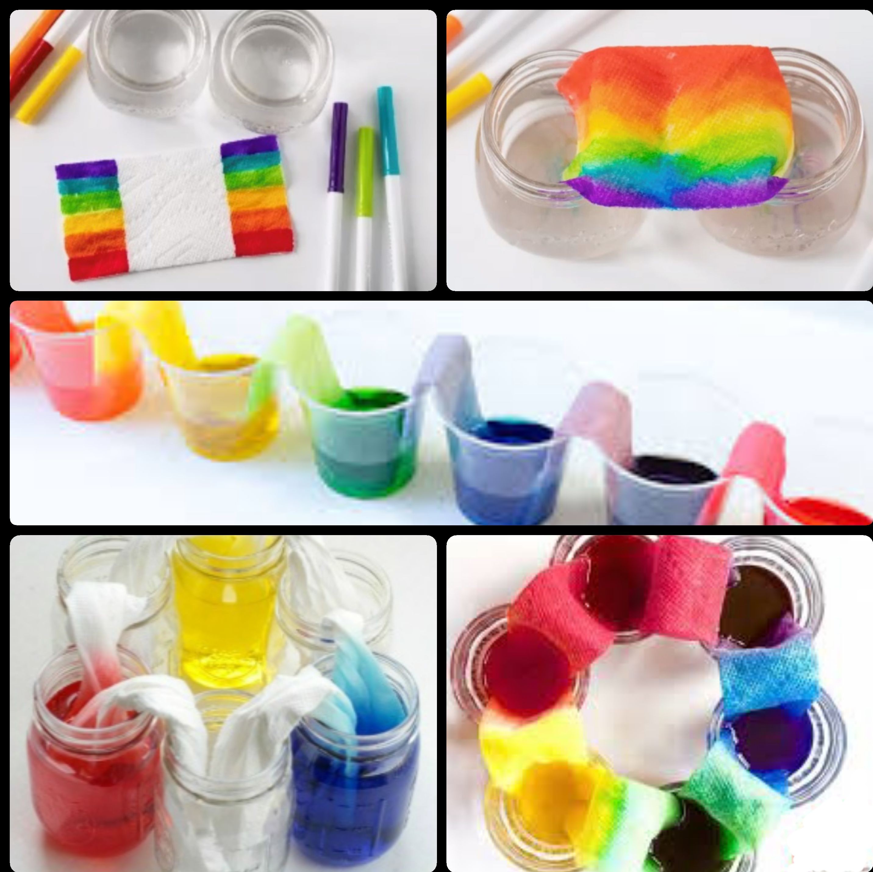 آزمایش آب و رنگین کمان گروه سنی: ۵ سال به بالا #آزمایش #بازی_حسی ابزار لازم: دستمال کاغذی حوله ای، لیوان شیشه ای، رنگ خوراکی، ماژیک رنگی، آب دو نوع آزمایش میشه انجام داد: ۱. دستمال رو چند لایه میکنیم و از دو طرف دستمال، حدود ۵ سانت، با ماژیک رنگ میکنیم. ترتیب رنگ ها در دو طرف دستمال باید یک جور باشن. دو لیوان شیشه ای رو آب میکنیم و هر طرف دستمال رو در یکی از لیوان ها قرار میدیم. نتیجه هیجان انگیزی داره 😍 ۲. برای آزمایش دوم، به ۶ قطعه دستمال حوله ای(چندلایه میکنیم تا ضخیم تر باشه) و ۶ لیوان شیشه ای نیاز داریم که ۳ تاشون رو آب میکنیم.(حدودا نصف تا سه چهارم لیوان آب داشته باشه). از سه رنگ اصلی زرد، آبی، قرمز در لیوان هایی که آب داره، یک قطره میریزیم. لیوان های خالی و پر رو یکی درمیون کنار هم قرار میدیم و دو طرف دستمال رو در لیوان های مجاور میگذاریم. به نحوی که یک سر دستمال در شیشه اول و سر دیگه ش در شیشه دوم باشه. دستمال بعدی، یک سرش در شیشه دوم و سر دیگه ش در شیشه سوم باشه و همینطور تا آخر(مطابق شکل) میتونیم لیوان ها رو به صورت دایره بچینیم یا ردیفی و به دنبال هم. حالا صبر میکنیم تا نتیجه جذابش رو ببینیم. با این آزمایش، بچه ها با عمل مویرگی و حرکت آب در الیاف دستمال آشنا میشن. همچنین ترکیب رنگ های اصلی و ساخت رنگ های فرعی رو میبینن و یه رنگین کمان کوچک درست میکنن🌈