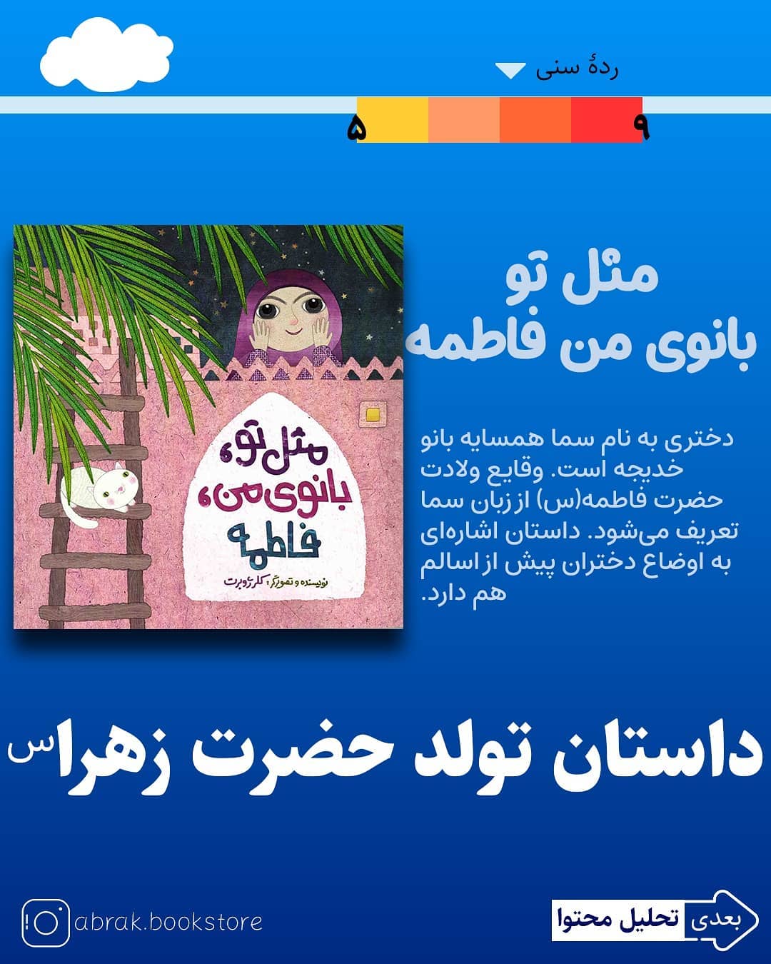 داستان از نگاه کودکی به نام «سما» در همسایگی خانه پیامبر خدا (ص) و حضرت خدیجه (س) روایت میشود. «سما» با نگاه لطیف و کودکانه به ماجرای تولد حضرت فاطمه (س) میپردازد. جدیدترین اثر «کِلر ژوبرت» با موضوع حضرت فاطمه زهرا 📕نام کتاب: مثل تو، بانوی من، فاطمه نویسنده: #کلر_ژوبرت ناشر: #رود_آبی 👫رده سنی: 5 تا 9 سال 💵قیمت: 20هزارتومان (ده درصد تخفیف تا دهم رمضان) 📩برای تهیه کتاب دایرکت بدهید ✔️به همراه کاربرگ و راهنمای فکرورزی رایگان😍 🔔تحلیل محتوای کتاب را در اسلایدهای داخلی ببینید برای مشاهده نکات دیگر کتاب به استوریها بروید @abrak.bookstore @abrak.bookstore 🌧️🌧️🌧️🌧️🌧️🌧️🌧️ #کتاب #ابرک #کودک #کتاب_کودک #حضرت_فاطمه #حضرت_خدیجه #حضرت_زهرا #پیامبر #کتاب_دینی #داستان_دینی #داستان_تخیلی #گربه #پیغمبر #حضرت_محمد #زیرگنبدکبود #تصویرگری #تصویرگری_مذهبی