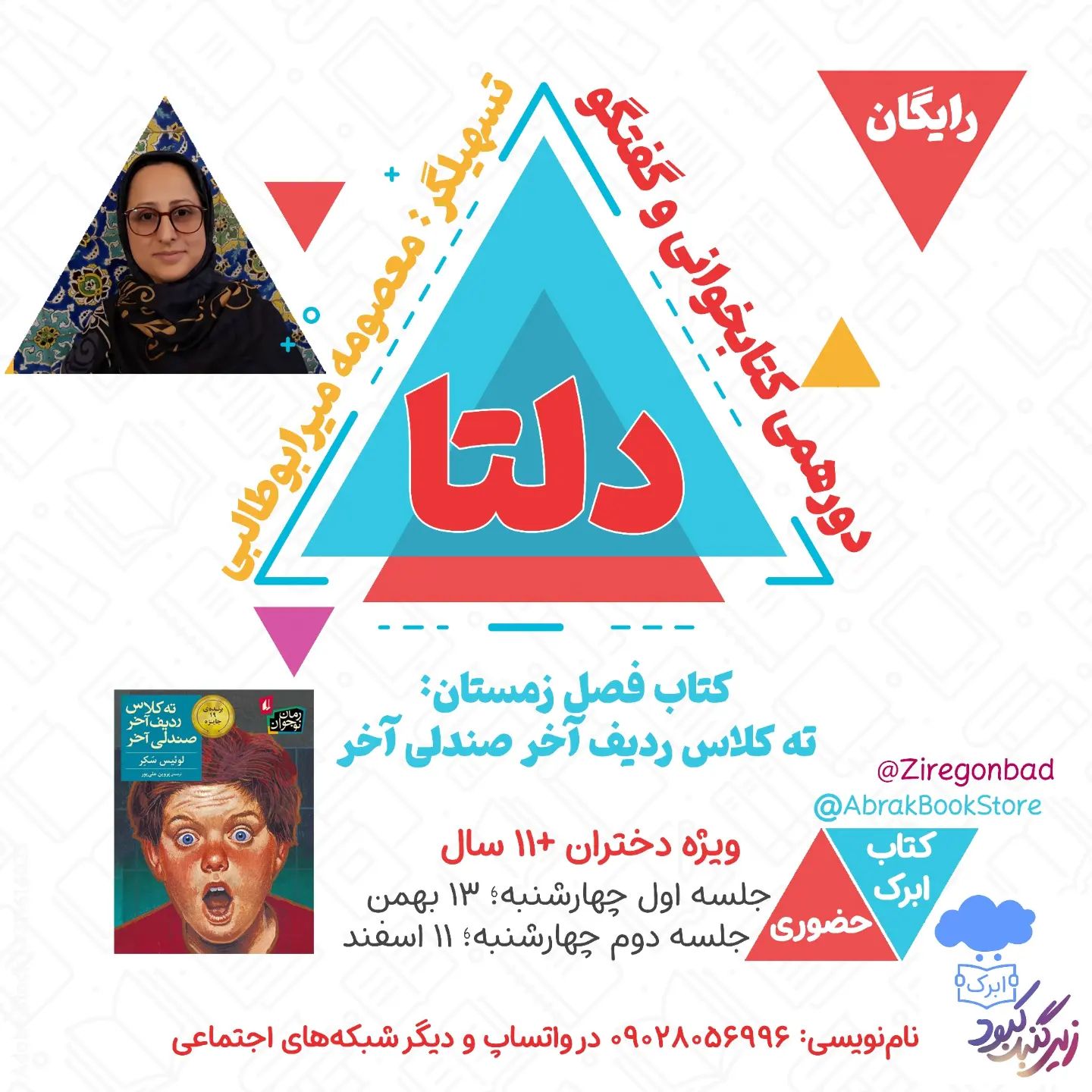 🏖️دلتا پیوند رود و دریاست در دلتا چه میکنیم؟ کتاب را میخوانیم درباره آن با هم گفتگو میکنیم حسابی زیر و رویش میکنیم و دل و روده داستان را میریزیم بیرون. 🔻🔺ظرفیت محدود🔺🔻 🔻برای نامنویسی میتونید همینجا دایرکت بدین @abrakbookstore @abrakbookstore @ziregonbad @ziregonbad 📍محل برگزاری: قم ، کتاب ابرک 👇اگه سوالی دارید 🔻 واتساپ ۰۹۰۲۸۰۵۶۹۹۶ #حلقه_کتابخوانی #رمان_نوجوان #معصومه_میرابوطالبی #نوجوان_دختر #نشرافق #ته_کلاس #دخترنوجوان #نوجوان_دختر #دخترانه #دورهمی_کتابخوانی #کتابخوانی #رمان #باهم_خوانی #همخوانی #جمع_خوانی #ابرک #زیرگنبد #زیرگنبدکبود #دلتا #قم