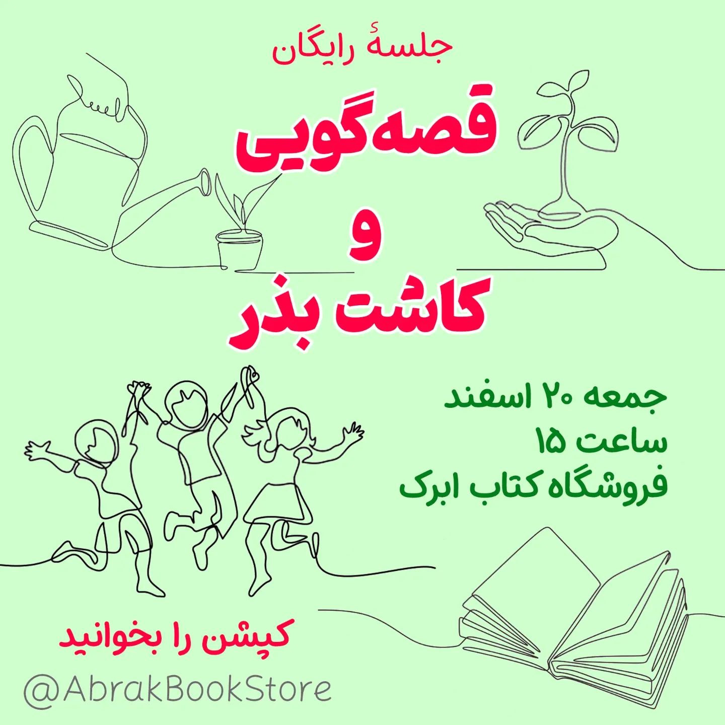 قراره با هم #کتاب بخوانیم و #قصه بگوییم و #بذر بکاریم. 🍀بذرها را بچهها داخل گلدان میکارند و با خود به خانه میبرند تا آمدن بهار و جوانهزدن دانهها و زندگی را با دستان خود لمس کنند. ☁️قصه برای کودکان ۴تا۸ سال مناسبه ولی کاشتن بذر برای هرسنی 💌برنامه رایگان است ولی گلدانها هزینه اندکی دارد. حدود ۹ تومان. البته میتوانید خودتان گلدان بیاورید. اگر میخواهید گلدان برایتان تهیه کنیم حتما تا ۵شنبه ساعت ۲۰ اطلاع بدهید. 🙏 برنامه در فضای باز بوستان برگزار میشود. 📍نشانی کتاب ابرک: پردیسان سبلان ۱۲ ⌚جمعه ۲۰اسفند ساعت ۱۵ 🌱بذری که میکاریم سبزی شاهی است تا بعداً به عنوان سبزی خوردن استفاده شود. شما اگر دوست دارید میتوانید بذر دلخواهتان را بیاورید. 📣خبر رو به گوش دوستان قمیتون برسونید ☁️فروشگاه کتاب ابرک 🌨️ @abrakbookstore @abrakbookstore #قم #پردیسان #قصه_گویی #کتابخوانی #ابرک #کتاب #کتاب_کودک #مهدکودک #بازی #طبیعتگردی #پارک #بهار #نوروز #سبزه #کاشتن #قصه