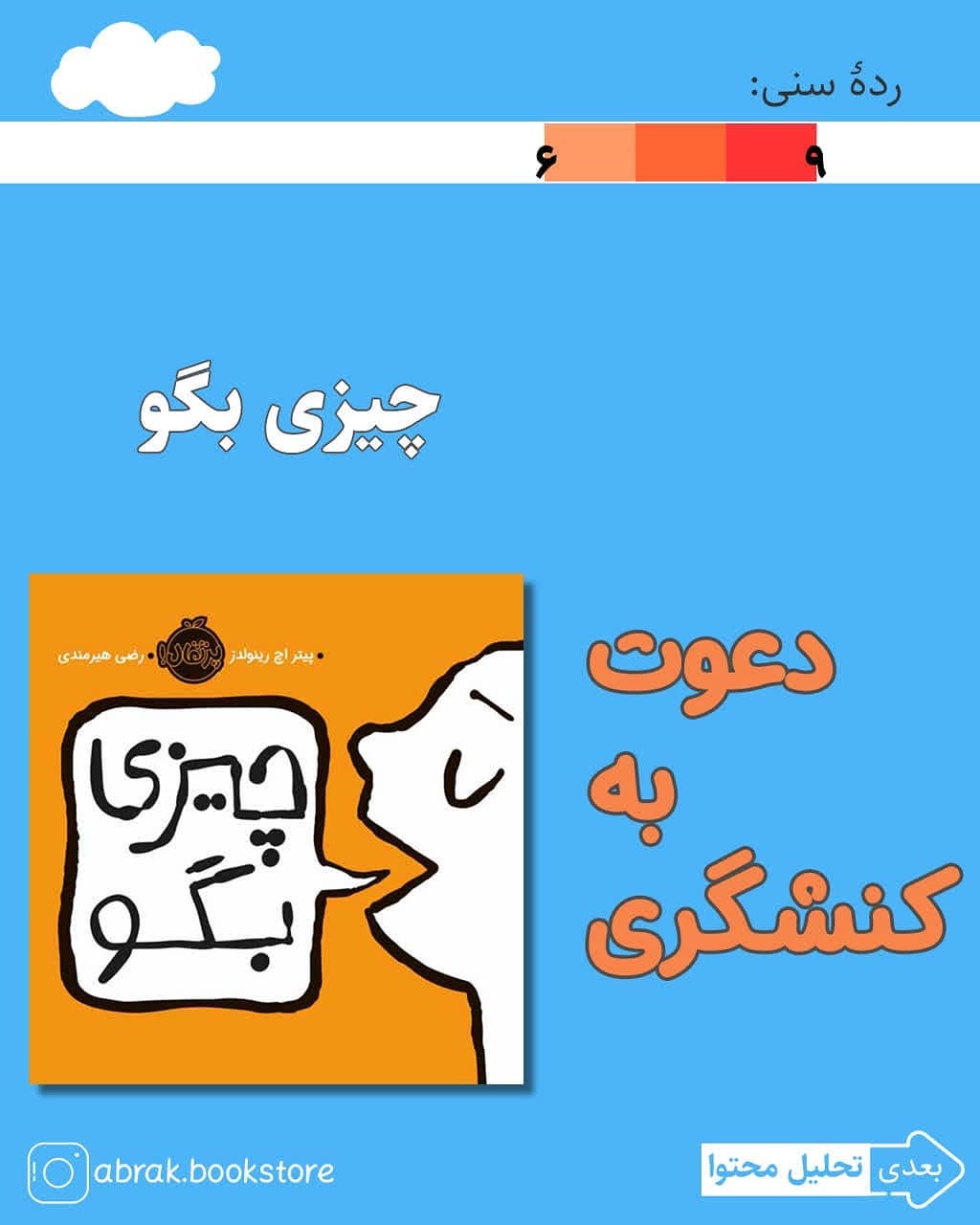 داستان از این قراره: کتاب، کودکان را ترغیب میکند تا با اعتماد به نفس به روشهای گوناگون ابراز عقیده کنند و دنیا را در جهت ایدههایشان با کار کردن و فعال بودن و کنشگری به دنیای بهتر هدایت کنند. 💵قیمت ۲۹۰۰۰تومان 📚برای تهیه کتاب دایرکت بدهید 📖تحلیل و نقد ادبی و تربیتی کتاب را در اسلایدهای داخلی ببینید. 💥کتاب همراه با راهنمای گفتگو و فکرورزی ارائه میشود. @abrak.bookstore @abrak.bookstore #کتاب_کودک #۶سال #چیزی_بگو #رضی_هیرمندی #پیتر_اچ_رینولدز #پرتقال #انتشارات_پرتقال #ابرک #کودک #کتاب #کتاب_خوب #معرفی_کتاب_کودک #peterhreynolds