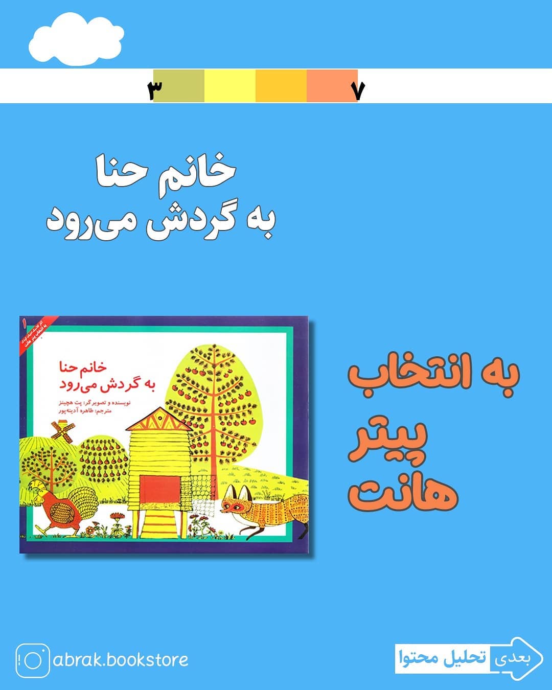 خانم حنا مرغ داستان تصویری تپل مپلی است که در مزرعه گردش میکند و روباه گرسنهای در پی او میرود تا یک لقمه چپش کند، اما خانم حنا از همهجا بیخبر است و هربار در تصاویر میبینیم به نحوی از دست روباه قسر در میرود. 💵قیمت: 16000 تومان 📩برای سفارش دایرکت بدهید 🌧️این کتاب، کتاب اول از مجموعه داستانهای کلاسیک به انتخاب پیتر هانت است که انتشارات علمی فرهنگی(پرنده آبی) آن را چاپ کرده است. نویسنده: #پت_هاچینز مترجم: #طاهره_آدینه_پور انتشارات: #پرنده_آبی 🌦️🌧️🌧️ @abrak.bookstore @abrak.bookstore #کتاب #کتاب_کودک #معرفی_کتاب_کودک #پیتر_هانت #کتاب_خوب #کتاب #ابرک #سرگرمی #داستان_کودک #قصه #قصه_کودکانه #peterhunt