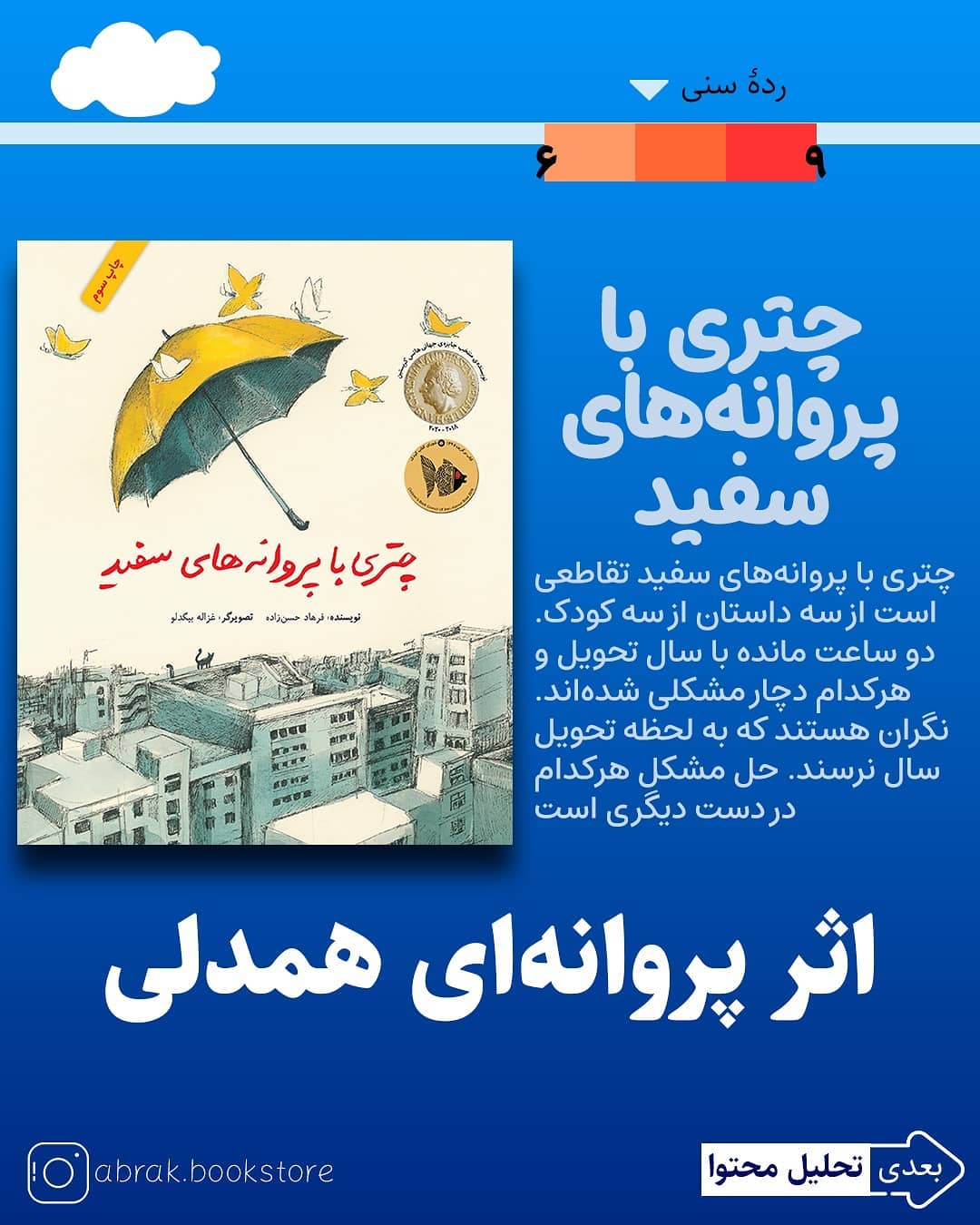 فقط دو ساعت به تحویل سال مانده و همه در تکاپوی مراسم نوروز هستند. اردلان در آرایشگاه منتظر است موهایش را کوتاه کند، آتوسا پشت در خیاطی ایستاده و مریم و علی سعی میکنند گلهایشان را زودتر بفروشند تا لحظهی تحویل سال در خانه پای سفرهی هفتسین باشند. به عقربههای ساعت نگاه کن! تو دو ساعت مانده به تحویل سال چهکار میکنی؟ به اطرافت دقت کن! شاید چتری با پروانههای سفید ببینی… ⭐کتاب برگزیده 1397 شورای کتاب کودک ⭐راه یافته به دوسالانه تصویرگری براتسلاوا ⭐تقدیر شده در دوسالانه طراحی گرافیک و تصویرگری نشان شیرازه 📕نام کتاب: چتری با پروانههای سفید ✏️نویسنده: #فرهاد_حسنزاده ناشر: #طوطی 👫رده سنی: 6 تا 9 سال 💵قیمت: 28هزارتومان 📩برای تهیه کتاب دایرکت بدهید ✔️به همراه کاربرگ و راهنمای فکرورزی رایگان😍 🔔تحلیل محتوای کتاب را در اسلایدهای داخلی ببینید @abrak.bookstore @abrak.bookstore 🌧️🌧️🌧️🌧️🌧️🌧️🌧️ #فرهاد_حسن_زاده #کتاب #کودک #چتر #اثر_پروانه_ای #چتری_با_پروانه_های_سفید #نشر_طوطی #انتشارات_فاطمی #مژگان_کلهر #غزاله_بیگدلو #شورای_کتاب_کودک #سال_تحویل #کتاب_کودک #معرفی_کتاب_کودک #پیشنهاد_کتاب_کودک #کتاب_کودک_خوب #کتابخوانی #همدلی