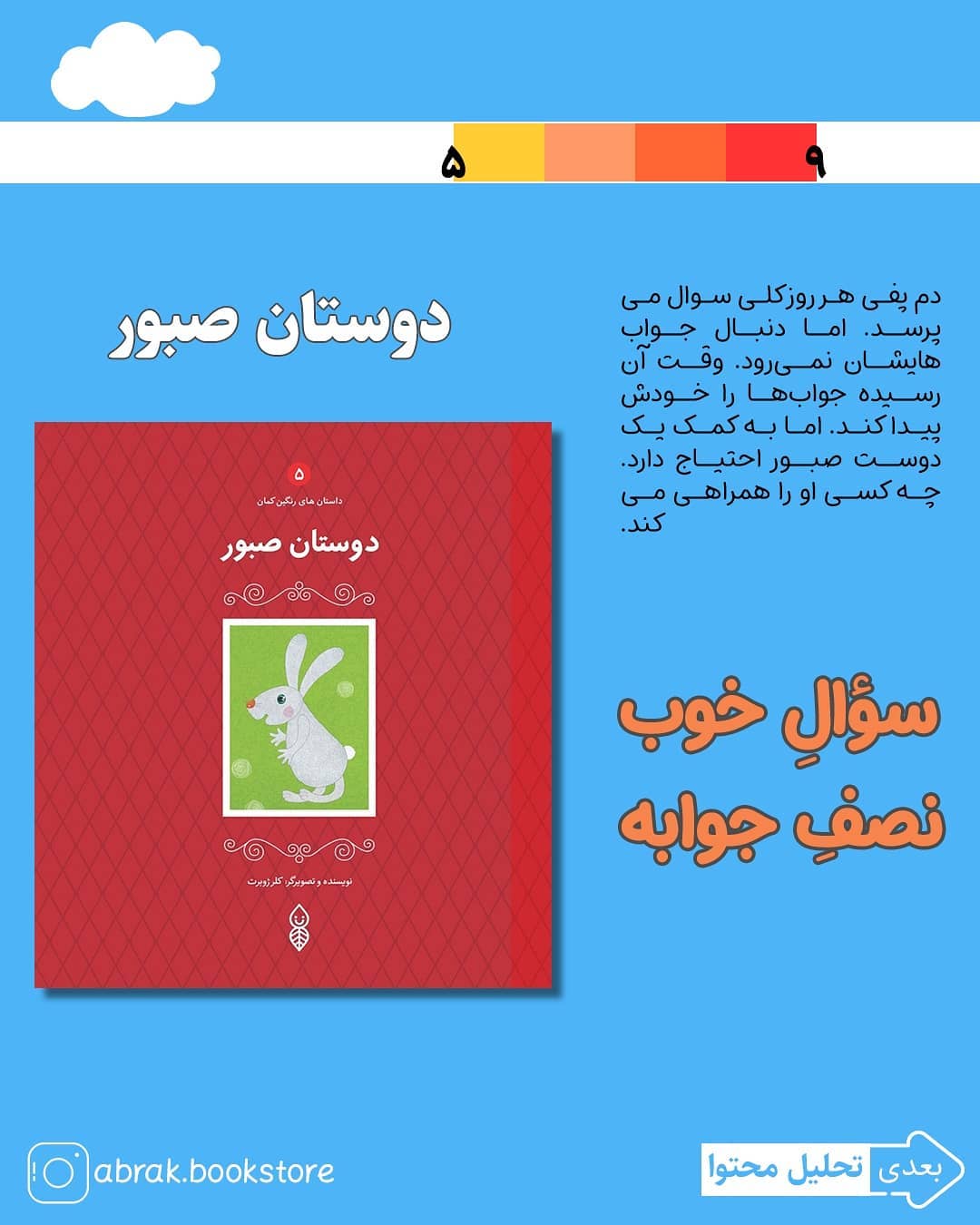 خلاصه داستان: دم پفی هر روز کلی سوال میپرسد. اما دنبال جوابهایشان نمیرود. وقت آن رسیده جوابها را خودش پیدا کند. اما به کمک یک دوست صبور احتیاج دارد. چه کسی او را همراهی میکند. 📚از مجموعه کتابهای رنگین کمان 💵قیمت مجموعه 5جلدی 70هزارتومان 📩برای تهیه کتاب دایرکت بدهید ⭐به همراه کاربرگ و راهنمای فکرورزی رایگان😍 نویسنده: کلر ژوبرت ناشر: شبنم رده سنی: 5تا9 سال @abrak.bookstore @abrak.bookstore 🌧️🌧️🌧️🌧️🌧️🌧️🌧️ #کلر_ژوبرت #داستان_کودک #کتاب_کودک #ابرک #کتاب #کتابفروشی_کودک #معرفی_کتاب #معرفی_کتاب_کودک #داستان_دینی #کتاب_دینی #تربیت_فرزند #ظلم #سوال #فبک #کنجکاوی #خرگوش #پیامبر #صبر #تربیت #تربیت_دینی