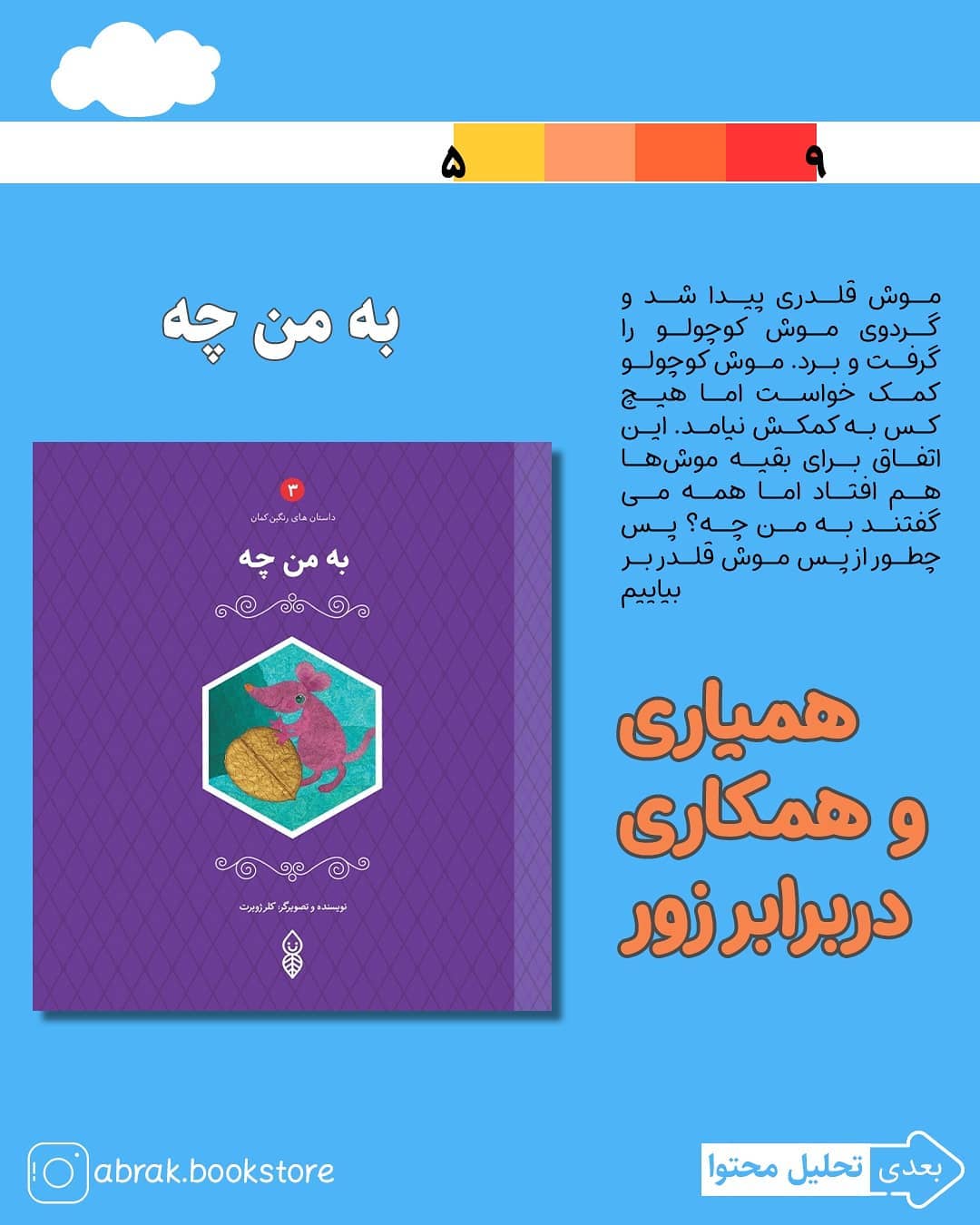 خلاصه داستان: موش قلدری پیدا شد و گردوی موش کوچولو را گرفت و برد. موش کوچولو کمک خواست اما هیچ کس به کمکش نیامد. این اتفاق برای بقیه موشها هم افتاد اما همه میگفتند به من چه؟ اگر به من چه پس به کی چه؟ پس چطور از پس موش قلدر بر بیاییم... 📚از مجموعه کتابهای رنگین کمان 💵قیمت مجموعه 5جلدی 70هزارتومان 📩برای تهیه کتاب دایرکت بدهید ⭐به همراه کاربرگ و راهنمای فکرورزی رایگان😍 نویسنده: کلر ژوبرت ناشر: شبنم رده سنی: 5تا9 سال @abrak.bookstore @abrak.bookstore 🌧️🌧️🌧️🌧️🌧️🌧️🌧️ #کلر_ژوبرت #داستان_کودک #کتاب_کودک #ابرک #کتاب #کتابفروشی_کودک #معرفی_کتاب #معرفی_کتاب_کودک #داستان_دینی #کتاب_دینی #تربیت_فرزند #ظلم #امام_علی #زورگویی #زور #عدالت #عدالتخواهی #موش #اتحاد