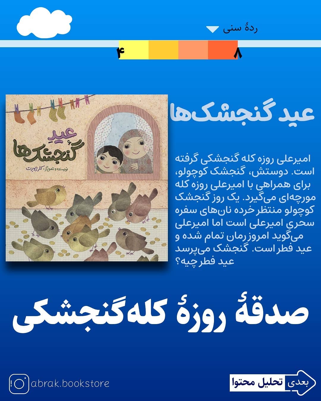 امیرعلی روزه کله گنجشکی گرفته است. دوستش، گنجشک کوچولو، برای همراهی با امیرعلی روزه کله مورچهای میگیرد. یک روز گنجشک کوچولو منتظر خرده نانهای سفره سحری امیرعلی است اما امیرعلی میگوید امروز رمان تمام شده و عید فطر است. گنجشک میپرسد عید فطر چیه؟ ✔️ کتاب بر اساس جملهای از امام موسی صدر ایدهپردازی و نوشته شده است. 📕نام کتاب: #عید_گنجشک_ها نویسنده: #کلر_ژوبرت ناشر: #رود_آبی 👫رده سنی: ۴ تا ۸ سال ✔️به همراه کاربرگ و راهنمای فکرورزی رایگان😍 🔔تحلیل محتوای کتاب را در اسلایدهای داخلی ببینید @abrak.bookstore @abrak.bookstore 🌧️🌧️🌧️🌧️🌧️🌧️🌧️ #کتاب #ابرک #کودک #کتاب_کودک #کلرژوبرت #رمضان #روزه_کله_گنجشکی #روزه_اولی #ماه_رمضان #روزه #عید_گنجشکها #گنجشک #فطر #صدقه #کتابخوانی #کاردستی #فهیمه_شانه #عید_فطر #جشن_تکلیف #سن_تکلیف #امیرعلی #مورچه #کله_گنجشکی