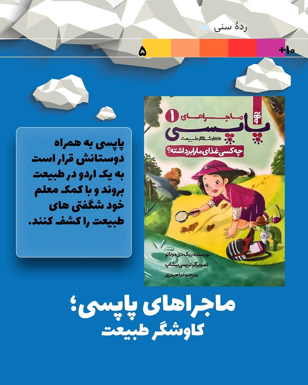 پاپسی به همراه دوستانش قرار است به یک اردو در طبیعت بروند و با کمک معلم خود شگفتی های طبیعت را کشف کنند. هفت شگفتی که در یک لیست نوشته اند و باید همه ی آنها را در طبیعت پیدا کنند و از آنها عکس بگیرند. شگفتی هایی مثل رد پای حیوانات یا خانه های آنها و… هر کسی باید یک همراه برای خودش انتخاب کند و در گروه های دو نفره به جست و جوی شگفتی های طبیعت بروند. پاپسی لاک پشتش آلفرد را انتخاب می کند و با هم دست به کار می شوند. اما در بدو شروع کاوش خود متوجه می شوند که غذایشان گم شده و انگار یک نفر آن را برداشته است… آنها با کمک هم رد پاها را دنبال می کنند تا به نتیجه ای جالب می رسند. 📕نام کتاب: #ماجراهای_پاپسی #کاوشگر_طبیعت نویسنده: ریک دی دوناتو ناشر: #آرما #نشر_آهو 👫رده سنی: 5 تا 10 سال 💵قیمت: 20هزارتومان 📩برای تهیه کتاب دایرکت بدهید ✔️به همراه کاربرگ و راهنمای فکرورزی رایگان😍 🔔تحلیل محتوای کتاب را در اسلایدهای داخلی ببینید @abrak.bookstore @abrak.bookstore 🌧️🌧️🌧️🌧️🌧️🌧️🌧️ #کتاب #محیط_زیست #کودک_محیط_زیستی #کودک_کاوشگر #داستان_علمی #گردش_علمی #گردش_درطبیعت #کتاب_کودک #کتاب_خوب #فروشگاه_کتاب #فروشگاه_کتاب_کودک #سفارش_کتاب_کودک #پاپسی