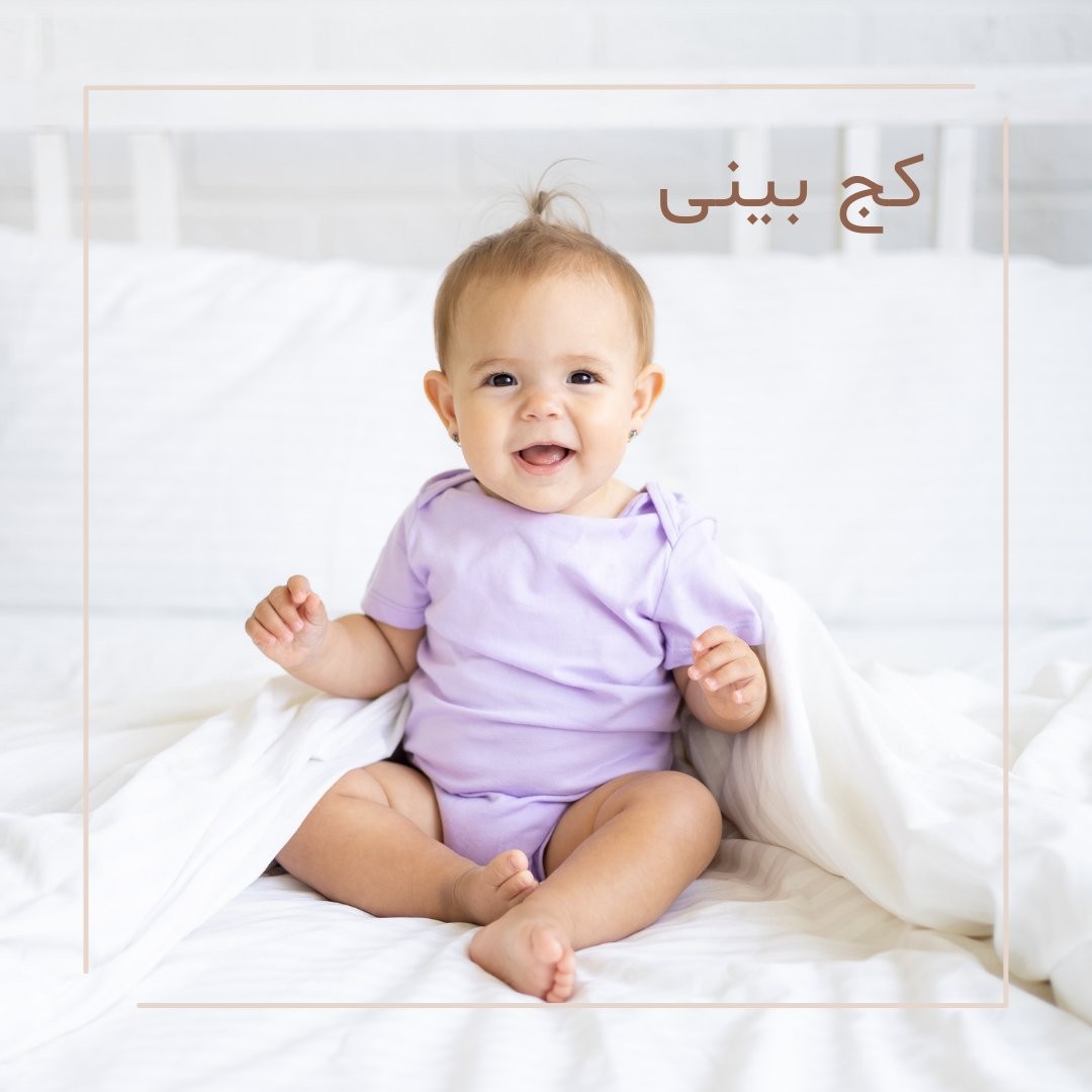 در بسیاری از موارد اینطور به نظر میآید که چشم نوزاد دارای کج بینی باشد، چرا که اغلب پلک فوقانی آنها دارای چینخوردگی است. این روند در ترکیب با پل مسطح وسیع بینی تصویری از کجبینی را در نوزادان ایجاد میکند. این تصویر میتواند از طریق نگاه کردن به انعکاس مردمک چشم، در صورت تمرکز هر دو چشم بر روی یک شیء میتواند مورد آزمایش قرار بگیرد. با رشد بیشتر ساختار صورت این حالت از بین میرود. منبع: کتاب راهنمای مراقبت از نوزاد
