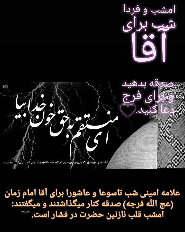 . 🖤 علامه امینی شب تاسوعا و عاشورا برای آقا امام زمان (عج الله فرجه) صدقه کنار میگذاشتند و میگفتند: امشب قلب نازنین حضرت در فشار است. . 🖤 امشب برای آقا صدقه بدهید و برای فرج دعا کنید. @drfamoradi
