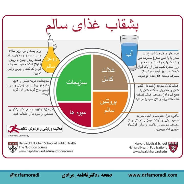 @drfamoradi #بشقاب_غذای_سالم . مدتی هست که بعضی از انجمن های تغذیه دنیا دیگر به «هرم غذایی» توجه ندارند و راهنماهای کارآمدتری برای انتخاب یک غذای سالم و متعادل ارائه داده اند. «بشقاب #غذای_سالم» توسط متخصصان تغذیه در دانشکده سلامت دانشگاه هاروارد و انتشارات سلامت هاروارد بدین منظور طراحی شده است. این راهنمای ساده شامل 6 دسته توصیه است: . ֎ توصیه می شود نیمی از بشقاب سلامتی میوه و سبزیجات باشد. میوه ها و سبزی های متنوع و رنگارنگ انتخاب شود. به یاد داشته باشید که سیب زمینی جزو این گروه محسوب نمی شود. سیب زمینی سرشار از نشاسته زود هضم است که اثری مشابه شکر و غلات تصفیه شده بر روی قند خون دارد به همین دلیل محدود کردن مصرف آن توصیه می¬شود. . ֎ یک چهارم بشقاب سلامتی با غلات کامل پر شود. منظور از غلات کامل این است که از دانه کامل استفاده و سبوس یا جوانه ی آن جدا نشده باشد مانند گندم یا جو کامل، برنج قهوه ای یا ماکارونی با آرد گندم کامل. مصرف غلات سبوس دار برای سلامتی بهتر است و اثر کمتری بر قند خون و انسولین دارد، چرا که غلات تصفیه شده (مانند نان سفید و برنج سفید) در بدن دقیقا مانند شکر عمل می کنند. . ֎ یک چهارم دیگر بشقاب را با منابع پروتئینی پر شود. ماهی، مرغ، حبوبات و آجیل از منابع سالم پروتئین هستند. مصرف گوشت قرمز (1) را کاهش دهید و از مصرف سوسیس، کالباس و سایرگوشت های فرآوری شده بپرهیزید. زیرا مصرف منظم، حتی با مقادیر کم این مواد، خطر بیماری¬های قلبی، دیابت، سرطان کولون و چاقی را افزایش می¬دهد. . ֎ بشقاب غذای سالم توصیه می کند که از روغن های سالم و گیاهی مثل روغن زیتون، ذرت، آفتابگردان و غیره به میزان متعادل استفاده شود، ولی توصیه نمی کند که مصرف روغن های سالم کم شود. این چربی های سالم باعث کاهش کلسترول مضر شده و برای سلامت قلب مفید هستند. مصرف روغن جامد و هیدروژنه، که حاوی چربی ترانس هستند، به هیچ وجه توصیه نمی شود. به یاد داشته باشید که غذاهای کم چربی لزوما سالم نیستند. . ֎ در طی روز از مایعات مختلفی مانند آب، چای یا قهوه (با شکر اندک) استفاده و مصرف شیر و لبنیات (2) به یک یا دو وعده در روز محدود شود. افزایش استفاده از لبنیات با افزایش خطر ابتلا به سرطان پروستات و تخمدان مرتبط است. مصرف آب¬میوه ها- حتی آب¬میوه های 100% طبیعی به دلیل قند و کالری زیاد آن ها- در حد یک لیوان کوچک در روز توصیه می شود. از مصرف نوشابه های قندی بپرهیزید چرا که این نوشابه ها انرژی بسیار زیاد و ارزش غذایی بسیار کمی دارند. . . #تغذیه_سالم_مرادی . . ادامه در کامنت اول👇👇