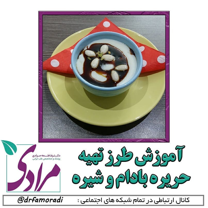 🍵 طرز تهیه حریره بادام و شیره ( فیلم آموزش را مشاهده کنید) 🔸️مواد لازم : 1️⃣ بادام خام ۶ عدد 2️⃣ شیر یک فنجان 3️⃣ گلاب یک قاشق مربا خوری 4️⃣ آرد برنج یک قاشق غذاخوری 5️⃣ شیره انگور ۱ قاشق غذاخوری 🔸️طرز تهیه: ابتدا بادام ها را با آب جوش به مدت دو ساعت خیس کرده و سپس پوست میکنیم. بادام و گلاب و شیر را داخل مخلوط کن، میکسر ریخته و یا با گوشتکوب برقی کاملا یک دست کرده و داخل ظرف مناسب می ریزیم و به همراه آرد برنج روی حرارت ملایم می گذاریم. دائم هم می زنیم تا به غلظت فرنی برسد. حریره بادام را داخل ظرف مناسب ریخته و با شیره انگور نوش جان کنید! 👈🏻 افراد با مزاج خشک بهتر است رقیق تر درست کنند. 👈🏻 حریره بادام بدون شیر (و با آب) هم قابل تهیه است. 👈🏻 اگر مخلوط کن یا گوشتکوب برقی در دسترس نیست می توانید بادام ها را رنده ریز کنید. . . . 🌐 برخی از خواص این غذا: . این حریره، برای کودکان، سالمندان، افراد ضعیف، و اشخاص کم وزن توصیه میشود. این غذا برای کم خوابی، یا افسردگی های فصل سرد نیز مفید است، و یکی از غذاهای مناسب برای تقویت باروری و همینطور، تقویت مغز است. جهت سرفه و گلودرد هم مناسب است. این غذا، رطوبت رسان خوبی برای افراد با مزاج خشک، مخصوصا با مزاج سرد و خشک (سوداوی ها) است، مخصوصا اگر یبوست گوارشی داشته باشند. افزودن شیره انگور به جای شکر، اثرات رطوبت بخشی بهتری به ترکیب بادام و شیر، که خود نیز از مواد غذایی رطوبت رسان هستند، داده است. . افرادیکه معده یا کبد ضعیف دارند نباید در مصرف آن زیاده روی کنند یا آن را، بدون شیر تهیه کنند. . . . #حریره_بادام_مرادی #شیره_انگور_مرادی #آشپزی_سالم_مرادی #حریره_بادام #شیره_انگور #حریره_بادام_و_شیره #مرطب #طب_ایرانی #طب_سنتی #دکتر_فاطمه_مرادی #دکتر_مرادی #تقویتی_مناسب #بادام_پوست_کنده #آموزش_آشپزی #فیلم_آموزشی #تقویت_باروری #ملین