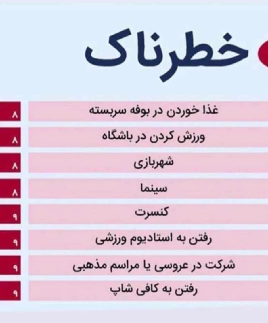 امتیازدهی به موقعیتهای خطرناک برای ابتلا به کرونا . . ماسکها را باید بست دستها را باید شست جور دیگر باید زیست دست اگر نتوان داد، اندوهی نیست خانه دوست اگر نتوان رفت، یادش هست میداند دوست، حال که تن را پای رفتن نیست خاطره را پر پرواز اما هست... دل به دریا باید داد با بال خیال حال که واکسن نیست، با ماسک باید زیست. . . @drfamoradi