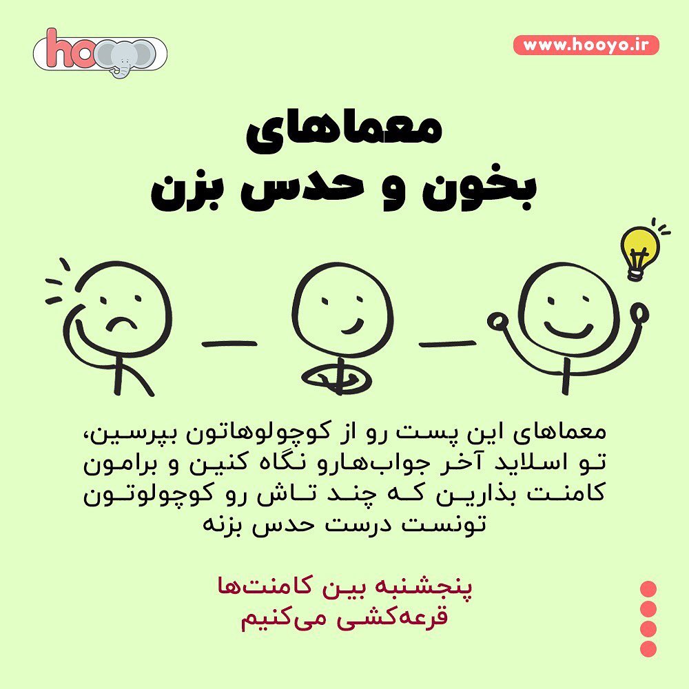 امشب میخوایم شما و کوچولوهاتون رو به یه چالش دعوت کنیم 🎖 . تو این پست، ۶ تا معما اومده (که همشون از مجموعه کتابهای «بخون و حدس بزن» هستن) معماهارو به کوچولوتون بگین و ازش بخواین حدس بزنه ⁉️ و برامون کامنت بذارین که به چند تاش تونست جواب بده 0️⃣1️⃣2️⃣3️⃣4️⃣5️⃣7️⃣ . . پنجشنبه، بین اونایی که کامنت گذاشتن قرعهکشی میکنیم و به ۳ نفر، اعتبار ۵۰ تومنی خرید اسباببازی هدیه میدیم 🎁 . . . . #معما #مسابقه #مسابقه_اینستاگرامی #چالش #چالش_جدید #قرعه_کشی #قرعهکشی #جایزه #هدیه #کدتخفیف #کد_تخفیف #کتاب #کتابخوانی #کتاب_خوب #کتاب_کودک #کامنت
