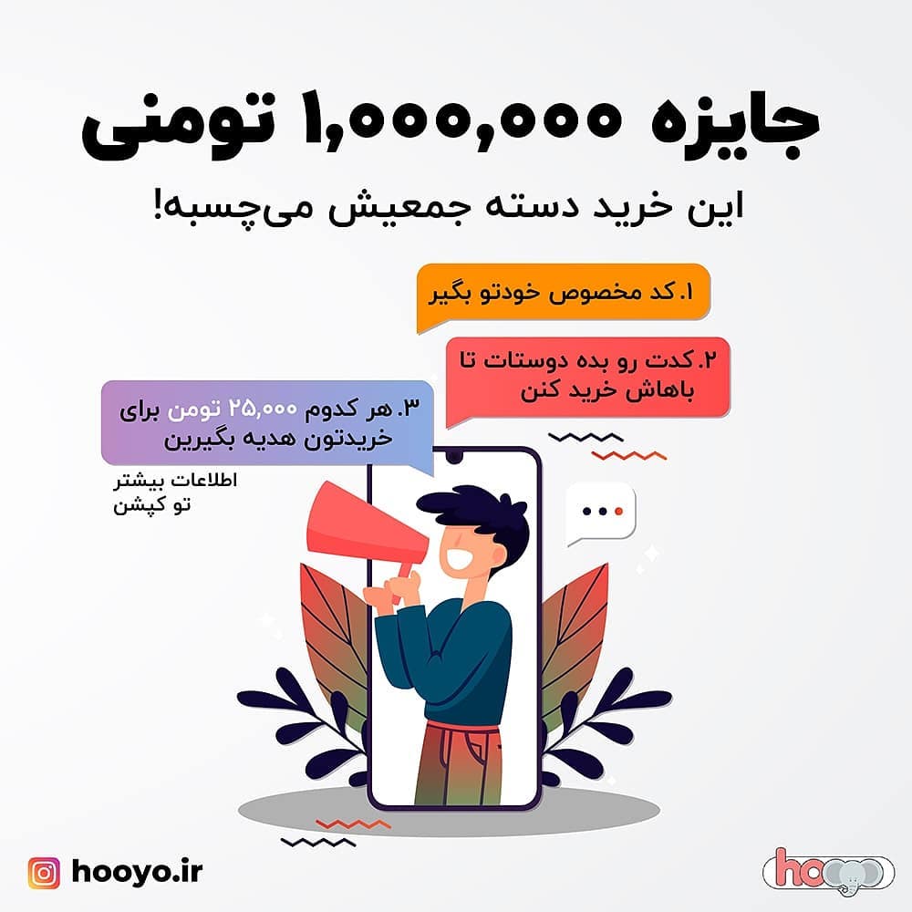 . این خرید دسته جمعیش میچسبه! 😍 . 🎁 ۱,۰۰۰,۰۰۰ تومن جایزه نقدی . 💥 مسابقه 💥 تو این مسابقه، شما باید هویو رو به دوستاتون معرفی کنین و از اونها بخواین تا با کد تخفیف مخصوص شما خرید کنن. با این کار هم شما و هم دوستتون هر کدوم ۲۵۰۰۰ تومن هدیه میگیرین. در آخر، ۱,۰۰۰,۰۰۰ میلیون تومن وجه نقد رو کسی میبره که بیشتر از بقیه بتونه دوستاشو دعوت به خرید از هویو بکنه. 🏆 . ❓ برای شرکت تو مسابقه باید چکار کنیم؟ 1️⃣ از طریق لینکی که توی بیو هست کد تخفیف مخصوص خودتون رو بگیرین. (اگر قبلا خرید کرده باشین، کد بطور خودکار براتون پیامک میشه) 2️⃣ هویو رو به دوستاتون معرفی کنین تا با کد تخفیف شما خرید کنن و ۲۵,۰۰۰ تومن تخفیف بگیرن. 3️⃣ بعد از هر خرید کیف پول شما توی سایت هویو ۲۵,۰۰۰ تومن شارژ میشه و یه قدم به جایزه یک میلیونی نزدیکتر میشین. . ⏳ تا آخر خرداد ماه فرصت دارین که توی این مسابقه شرکت کنین. فرصت رو از دست ندین. . . . . #مسابقه #مسابقه_اینستاگرامی #جایزه #جایزه_بزرگ #جایزه_نقدی #تخفیف_ویژه #تخفیف