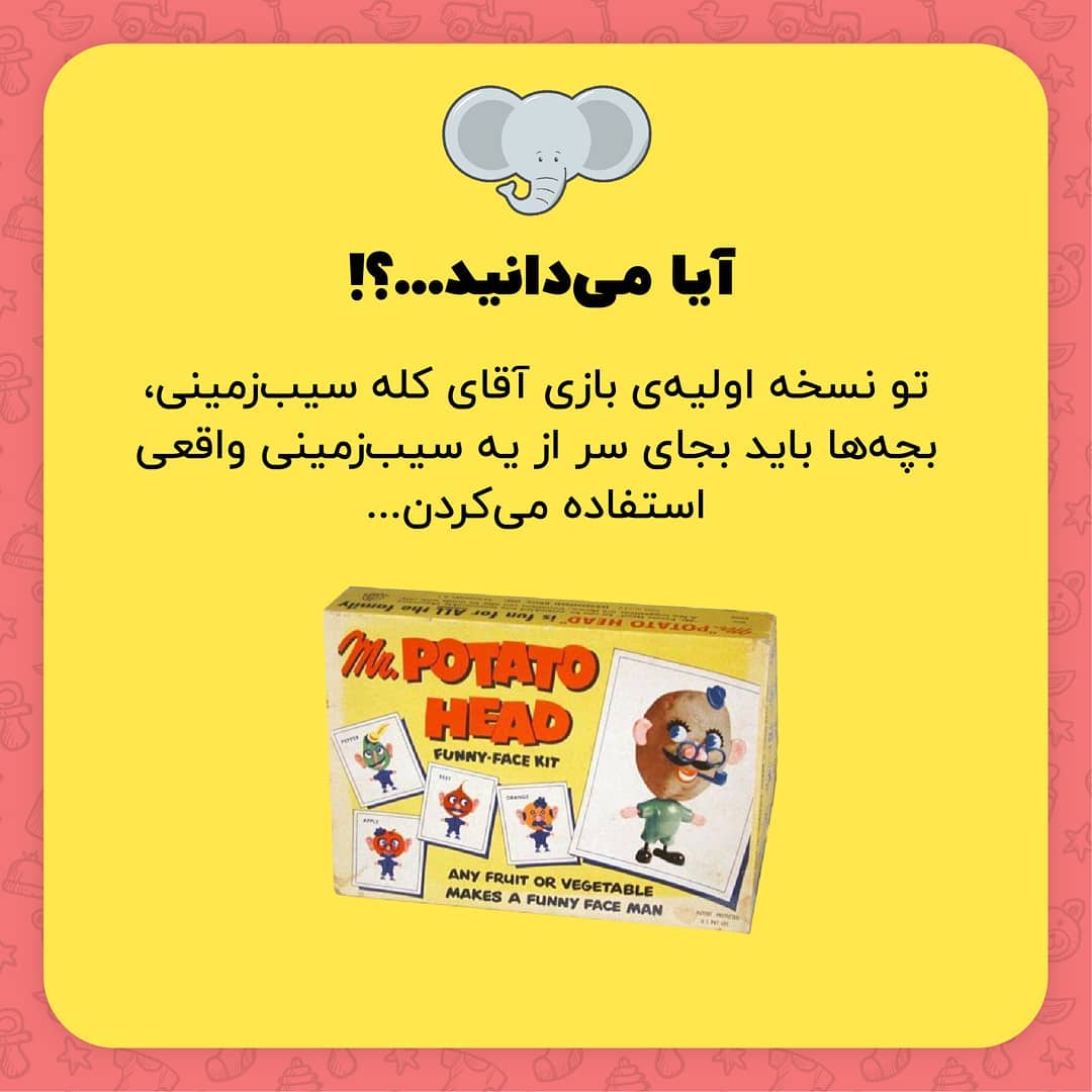 . انیمیشن توی استوری (toy story) رو دیدین؟ . آقای کله سیب زمینی یا همون Mr Potato head یکی از شخصیتهای این انیمیشنه که از روی یه اسباببازی با همون اسم ساخته شده. نکته جالب اینجاست که این اسباببازی تو سالهای اول تولیدش فقط یه سری چشم و دست و پا پلاستیکی بوده و بچهها باید یه سیب زمینی واقعی رو بجای سرش میذاشتن. . . . . . . . . #جالب #دانستنی #علمی #عجیب #باحال #دانستنی #دانستنیها #نوزادپسر #نوزاددختر #بچه_ناز #کودک_من #حیوانات #نوزاد #نینی #کودکی #نینی_ناز #دوقلو #توی_استوری #toystory #toy_story #mrpotatohead