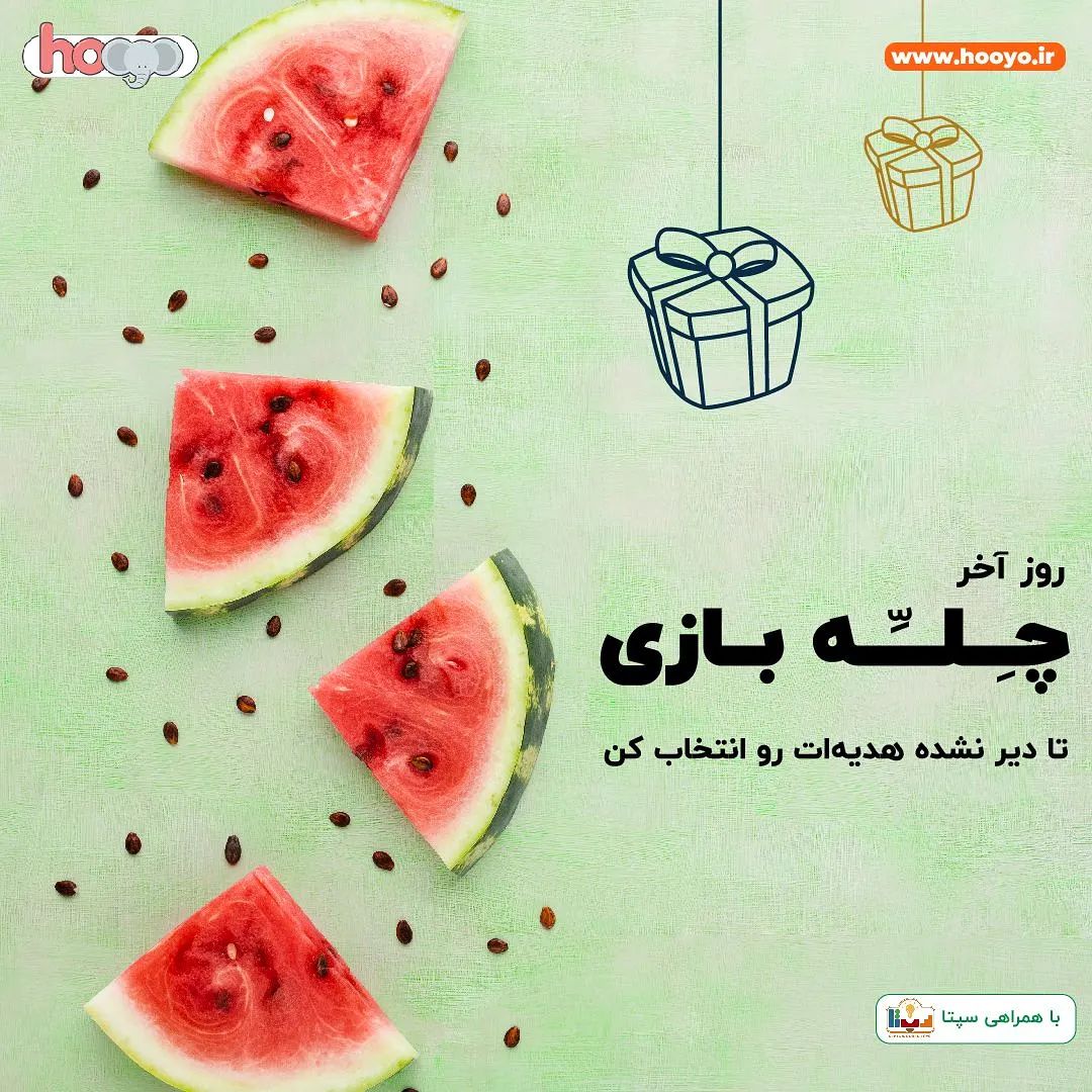 بدوئین هدیهها داره تموم میشه... 😱 _________________________________________ امروز روز آخر کمپین چلهبازی هست... 🍉 پس تا دیر نشده با خرید بالای ۳۰۰ هزار تومن یه هدیه به انتخاب خودتون دریافت میکنین 🎁 چلهبازی 🥳 hooyo.ir/yalda1400 _________________________________________ چلهبازی ۱۴۰۰ با همراهی سپتا @septatoys