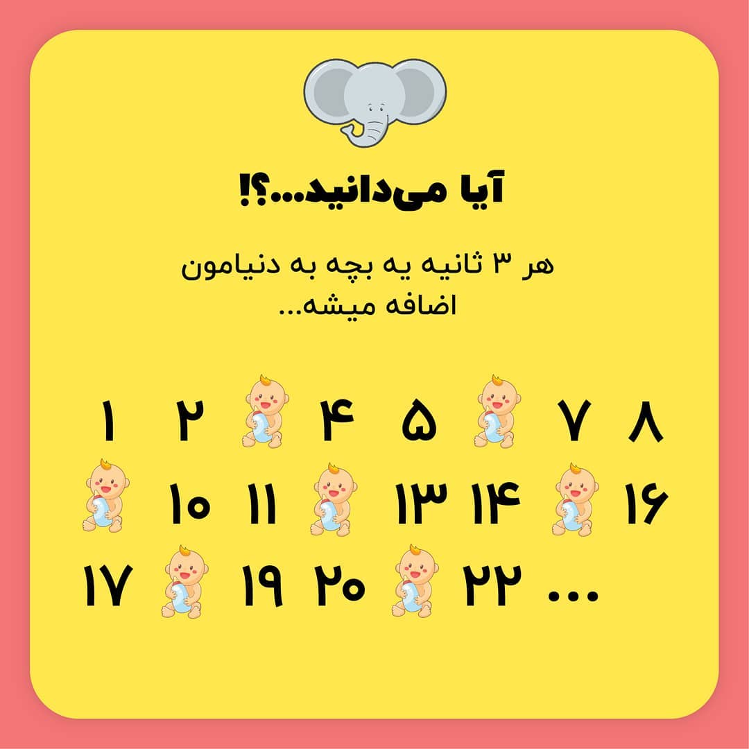. شروع کنین به شمردن: یک، دو، یه بچه 👶، چهار، پنج، یکی دیگه 👶، هفت، هشت، یکی دیگه 👶 ... یعنی تو یه روز حدود ۲۹۰۰۰ تا بچه بدنیا میاد. فوق العاده نیست؟ 😍 . مامانای باردار رو تگ کنید. . . . . . . #نینی #جالبترین #مفید #دانستنیها #بچه_ناز #نوزاد #نوزادی #بارداری #نوزادپسر #نوزاددختر #عجیب #عجایب #جالب #علمی #دانستنی #باحال #آیامیدانید #اطلاعات_عمومی