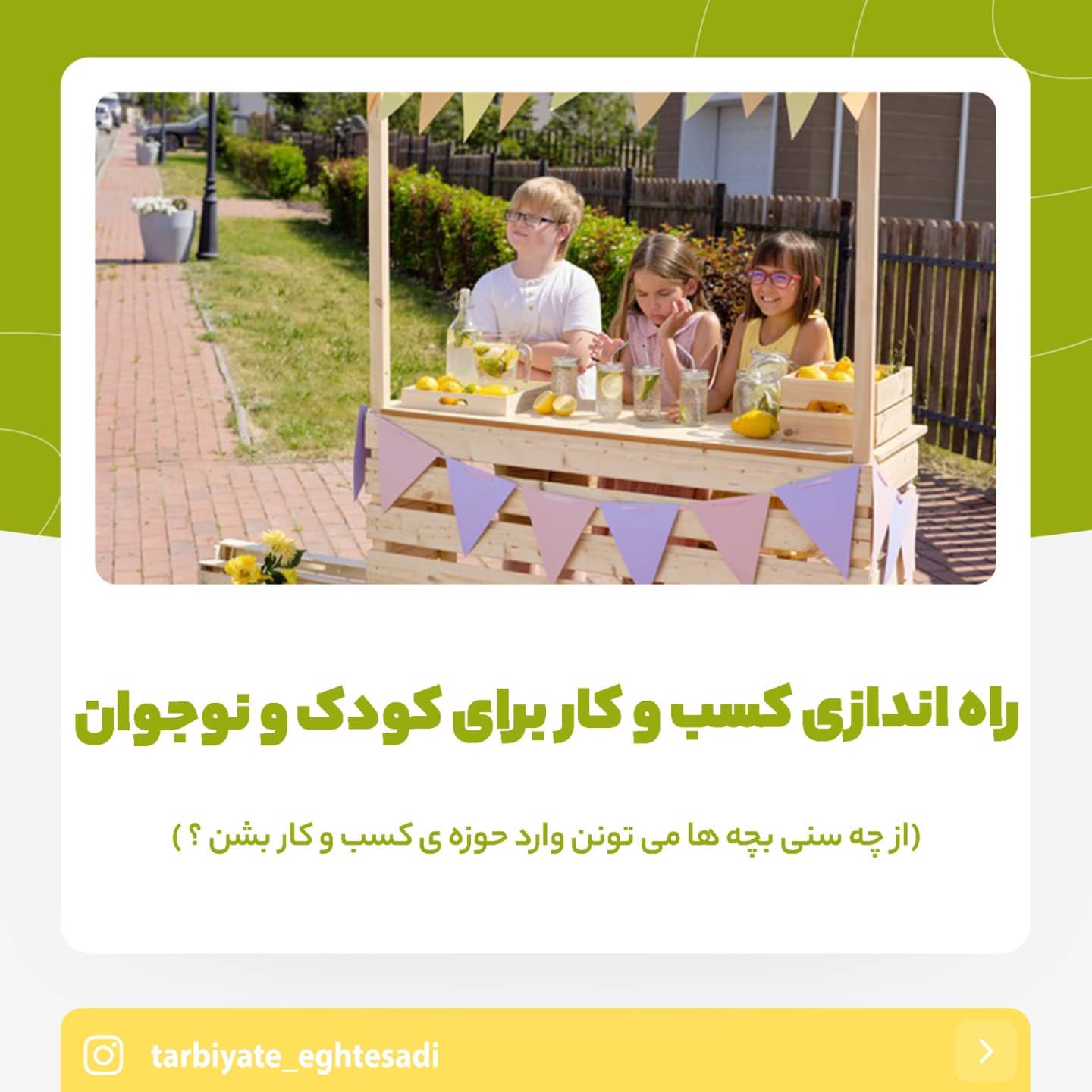 . . 💛 به نام خدا 💛. . 🟢 سلام سلام ، امیدوارم حالتون خوب باشه. تو این پست سنی که بچه ها میتونن وارد حوزه ی کسب و کار بشن رو توضیح دادم، البته آقای دکتر پیغامی و خانم جاویدی کمکم کردن که ازشون ممنونم. . 🔴 تشکر از مطهره جانِ جاویدی که اطلاعاتش رو در اختیارم قرار داد ، راستی پیجِ نوآک هم برگشته میتونید فالوشون کنید. . _________________________________. @noak.academy . @motahare.javidy. _________________________________. . #اقتصاد#تربیت#کودک #کسب_و_کار#کسبوکار. #کارآفرینی#کارآفرین. #کارآفرینی_کودکان. #کارآفرینی_کودک . #سواد_مالی_کودک. .