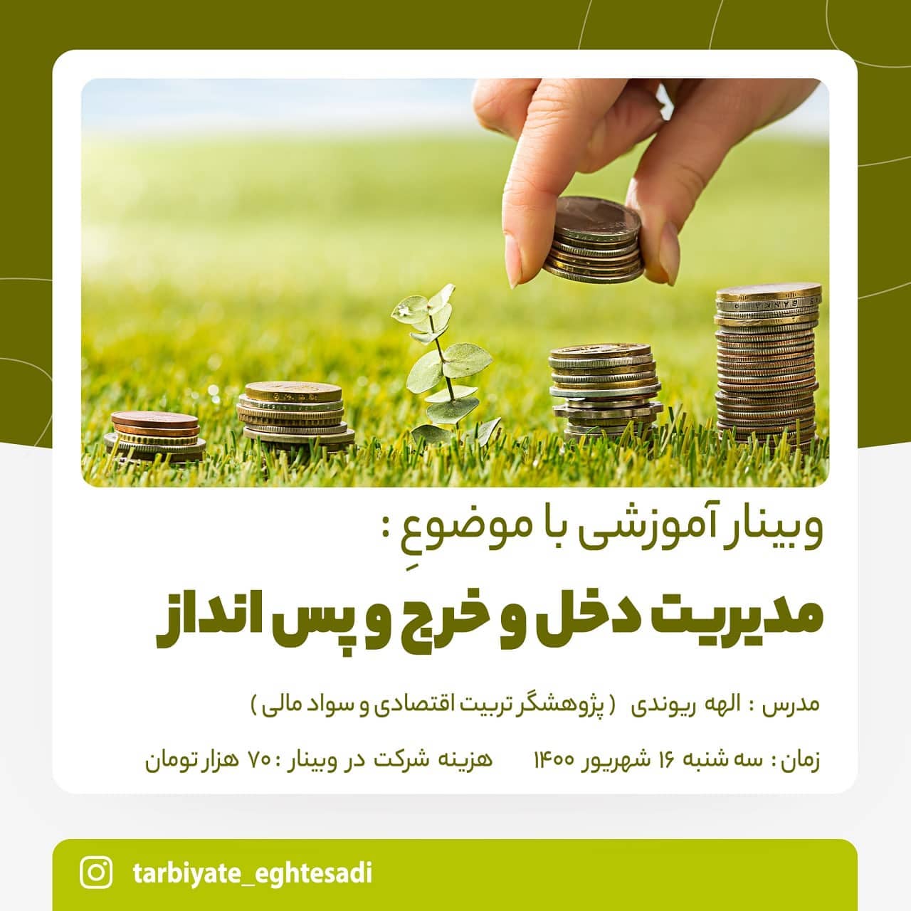 . 💚 به نام خدا 💚. . 🔷 اگر تا آخر ماه پول کم میارید و نمی تونید مدیریت کنید ، این وبینار خیلی کمکتون میکنه. . 🔴 وبینار ، دو ساعت ( شاید کمی بیشتر طول بکشه ) و به صورت لایو اینستاگرام برگزار میشه. 🟣 ساعت ۱۸ تا ۲۰. . 🟠 بعد از ثبت نام ، در پیج اینستا عضوتون میکنم. . 🟡 تا سه روز هم لایو ذخیره میمونه تا استفاده کنید. . 🟢 ممنون میشم هر کی براش مقدور بود این پست رو استوری کنه. . #وبینار#دخل_و_خرج#دخل_و_خرج_خانواده. #دخل_وخرج#پس_انداز#پس_انداز_کردن. #پس_اندازکردن#پس_انداز_پول. #پسانداز#پساندازپول#لایو_اینستاگرام. #لایو#سواد_مالی_خانواده. #سواد_مالی_و_اقتصادی. #سواد_مالی#سواد_مالی_شخصی. #مدیریت#اقتصاد#تربیت. #هوش_مالی#هوشمالی. .