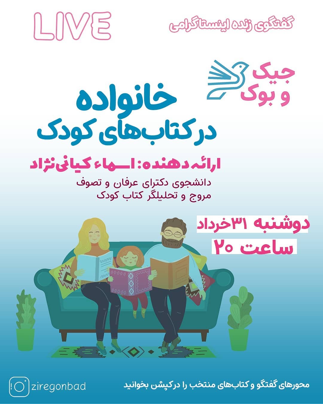 تا حالا به این دقت کردین که مادر و پدر و مادربزرگ و پدربزرگ با چه ویژگیهایی در کتابهای کودک نمایش داده میشوند؟ در گفتگوی زنده با خانم کیانی نژاد قرار است ایشان به این مسئله بپردازند و کتابهای زیر را برای هر یک از نقشها بررسی کنند. 🧔نقش پدری: «پدر، پرچین،پسرها» و «نگران نباش داگلی بغلی» 🧕نقش مادری: «رز به دیدن وینترگارتن میرود» و «مهمترین شغل دنیا» 👪نقش والدگری: «خرس بزرگ و خرس کوچک» 👴نقش پدربزرگ: «یک داستان محشر» کدام یک از این کتابها را خواندهاید؟ نظر شما چیست؟ @ziregonbad @ziregonbad #کتاب_کودک #کتاب_خوب #کتابخوانی #کودک_کتابخوان #ادبیات_فارسی #ادبیات_کودک #ادبیات_کودک_و_نوجوان #ادبیات_کودکان #داستان #داستان_کودک #تصویرگری #تصویرگری_کتاب_کودک