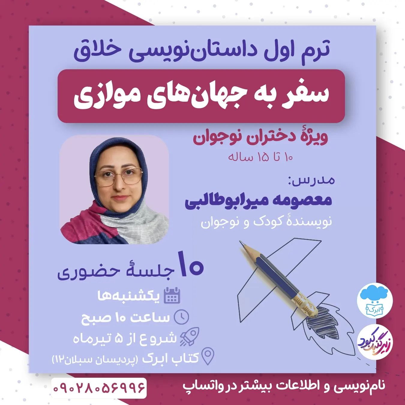 در کتاب ابرک و مجموعه زیرگنبدکبود دورههای متعدد کتابخوانی برای نوجوانان (دلتا) را با تسهیلگری خانم معصومه میرابوطالبی برگزار کردهایم حالا با درخواست مخاطبین میخواهیم اولین دوره آموزش داستاننویسی خلاق را با تدریس خانم میرابوطالبی برگزار کنیم. میرابوطالبی، متولد 1360 است و کارشناسی ارشد ادبیات کودک و نوجوان دارد. از ایشان داستان و رمانهای متعددی منتشر شده که بیشتر آنها در زمینه ادبیات نوجوان است و جوایز متعددی را کسب کرده است. برخی از این کتابها و فعالیتهای دیگر خانم میرابوطالبی و نیز سرفصلهای دوره را در برگههای داخلی بخوانید. برای نامنویسی به شماره واتساپ زیر پیام دهید یا از لینک ورقه آخر وارد صفحه نامنویسی شوید. 09028056996 #کتاب #داستان_نویسی #داستان #نوجوان #کلاس_داستان_نویسی #معصومه_میرابوطالبی #ابرک #قم #زیرگنبدکبود