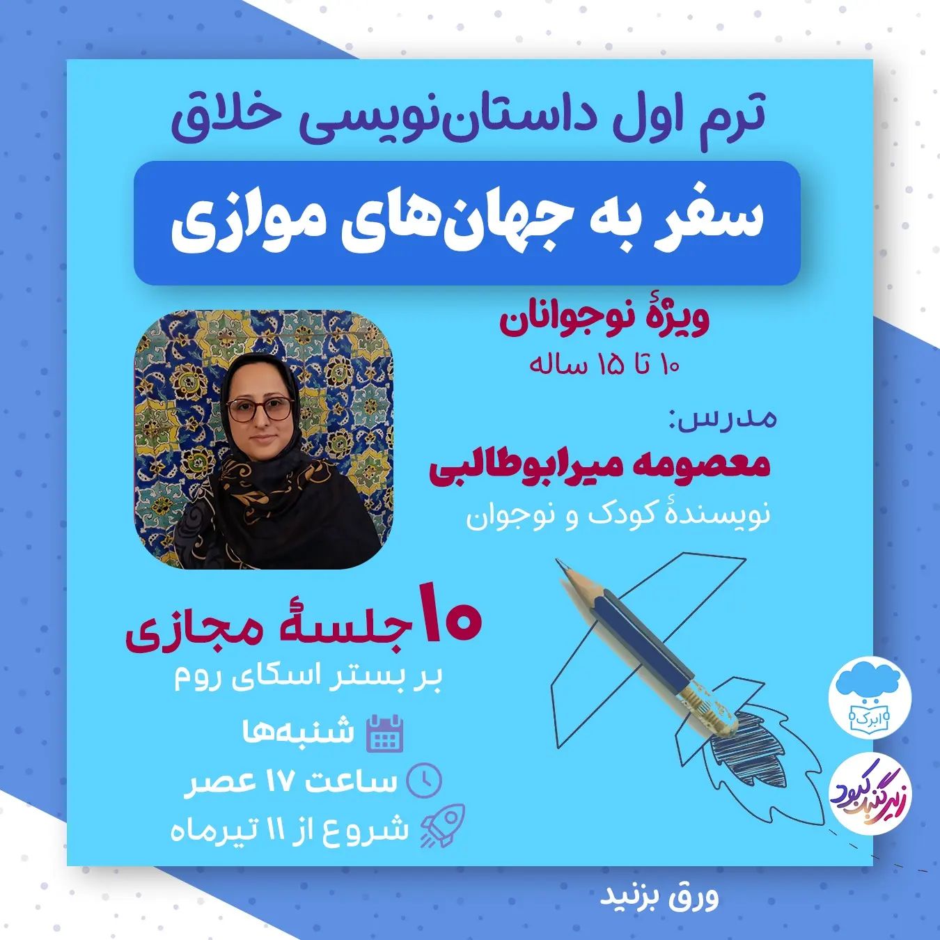 دوره مجازی آموزش داستان نویسی خلاق ویژه نوجوانان 10تا15 سال (پسران و دختران) «سفر به جهانهای موازی» مربی: معصومه میرابوطالبی ✅ چرا این دوره را توصیه میکنیم؟ چون مدرس دوره، خانم میرابوطالبی دو تخصص دارند ☝️تخصص اولشان داستان و ادبیات هست. از لحاظ فنی داستان را میشناسد ✌️تخصص دوم ایشان هم تسلط بر هنر و مهارت ارتباط با نوجوانان و برگزاری دورههای متعدد با این گروه سنی است. 👌خانم میرابوطالبی رمانهای متعددی برای نوجوانان آفریدهاند که عناوین و جوایز آنها را میتوانید در تصاویر ببینید. 🎉هدیه ابرک: بن تخفیف 20درصدی خرید کتاب از ابرک تا 200 هزارتومان ▪️هزینه دوره: 500هزارتومان 🎊تخفیف 15 درصدی نامنویسی برای ۵ نفر اول با کد تخفیف abrak 📲ارتباط با ما واتساپ 09028056996 مجموعه آموزشی زیرگنبدکبود و فروشگاه کتاب ابرک @ziregonbad @abrakbookstore #نوجوان #آموزش_داستان_نویسی #آموزش_نویسندگی #معصومه_میرابوطالبی #داستان #کتاب