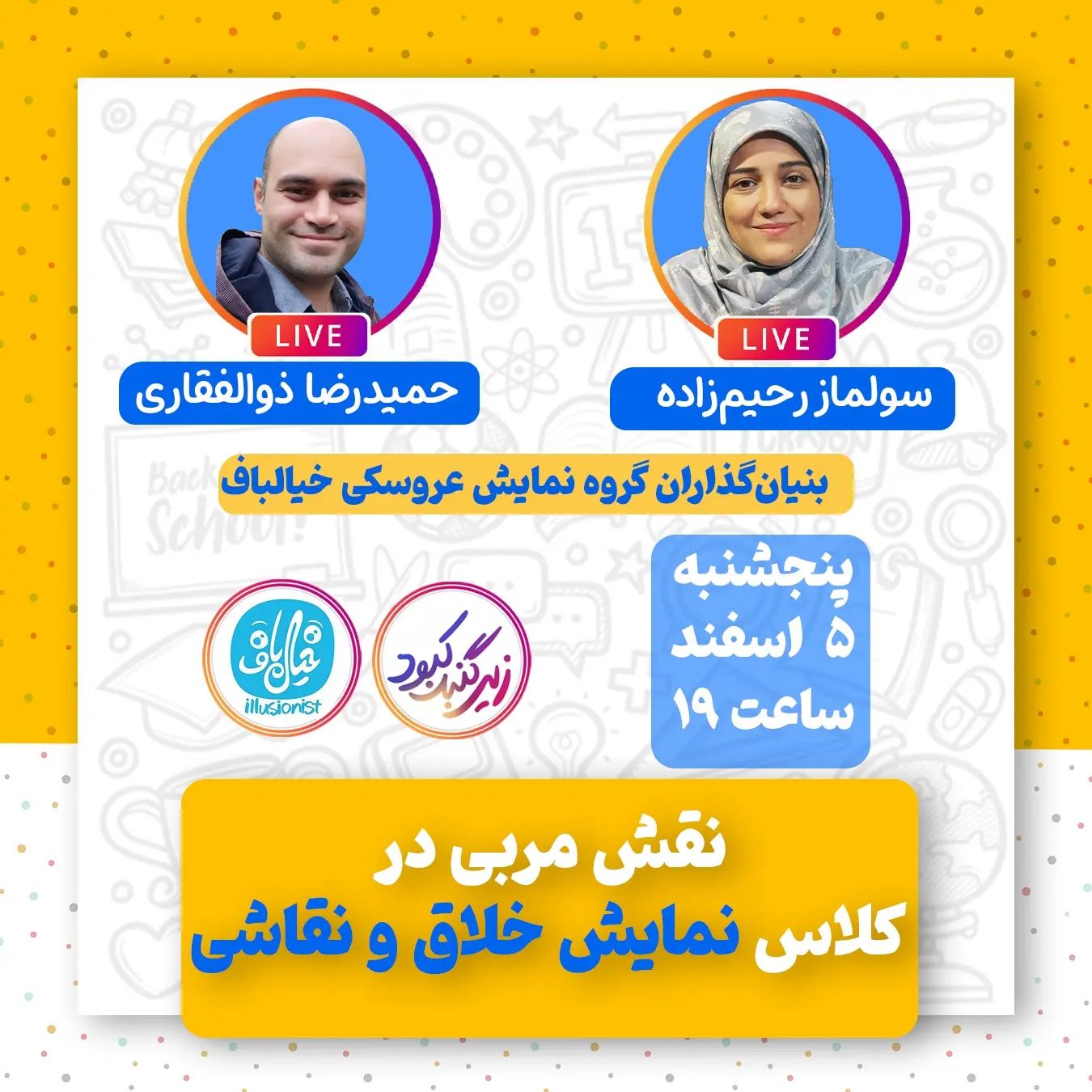 مربی نقش مهمی توی کلاس داره چه کلاسی؟ هر کلاسی مخصوصاً اگر گروه سنی پایین باشه و محتوا و قالب ارائه پیچیدهتر. 💌ما چند صباحی است که با گروه خیالباف آشنا شدیم. فعالیتهایشان را میدیدم. حالا خوب است پای صحبت بنیانگذاران و مربیان این مجموعه دوست داشتنی و کاربلد بنشینیم و از تجربیاتشان بیاموزیم. 🔻جایگاه مربی در کلاس نمایش خلاق و نقاشی چیست؟ 🔻مربی با چه چالشهایی رو به روست؟ 🔻رویکرد خیالباف چیست؟ ✅این لایو رو از دست ندین🍀 ⭕پنجشنبه ساعت ۱۹ @ziregonbad @khialbaf.group #زیرگنبد #خیالباف #نمایش_خلاق #نقاشی #کودک #کلاس_درس #معلم_خلاق #مربی_مهد #مربیگری #قصه_گویی
