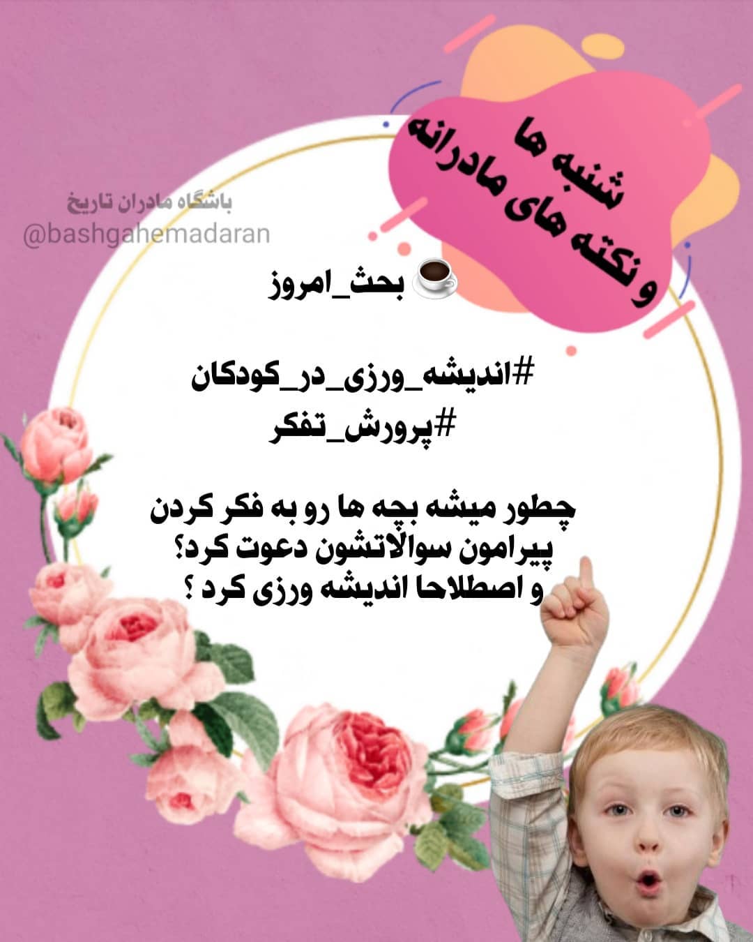 بسم الله... حتما زیاد شنیدید که بهتره جواب سوال بچه ها رو مستقیم ندیم تا بتونن پیرامون مسائل مختلف فکر کنن... چطور میشه بچه ها رو اندیشه ورز و اهل تفکر تربیت کرد؟! #اندیشه_ورزی_در_کودکان ✳اولین قدم در این راه شناخت کودک و ویژگی های او و رشد شناختی و حیطه ادراکیش در سنین مختلف هست. ✳این طوری از سوالهای زیاد بچه ها کلافه نمیشیم و می دونیم کی و چطور و چقدر سوال پیچمون می کنن؟! ✳قدم بعدی پذیرش سوالهاشون و این روحیه پرسشگری و میل به دانستن و کنجکاوی هست. ✳سعی کنیم در برابر سوالها شوک بازخورد منفی ندیم؛ *چقدر سوال میپرسی؟!گفتم که برات! بزرگ شی میفهمی و...* ✳اینها راه های مستقیما مرتبط هستن ولی پیش زمینه هایی وجود داره که ظاهرا مرتبط نیستن ولی بسیار مهمن .. ✳طبق روایت اگر بچه ها در کوچکی بازیگوشی زیادی داشته باشن در بزرگسالی اهل تعقل و تفکر میشن. ✳باید زمینه رو برای ارضای نیاز بچه ها به تخلیه انرژی و هیجانی ایجاد کرد.. ✳و از طرفی پرورش حسی هم زمینه مهم دیگری برای رشد عقلی بچه هاست. ✳در زندگی روزمره بچه ها رو درگیر کنیم تا فکرشون رو به کار بندازن ✳از کارهای عمومی و مسائلی که در زندگی روزمره پیش میاد و خود ما برای حل کردنشون نیاز به تفکر داریم تا مسائل خاص مثل تفکر در موضوع یک کتاب یا کارتون که میشه باب گفتگو رو باز کرد و جرقه ها رو در ذهن کودک زد... شما با چه روش هایی به تقویت تفکر بچه ها میپردازید؟! می تونید سوال های جالب بچه ها رو برامون کامنت کنید😍 #شنبه_های_باشگاه #باشگاه_مادران_تاریخ #اندیشه_ورزی #تقویت_تفکر