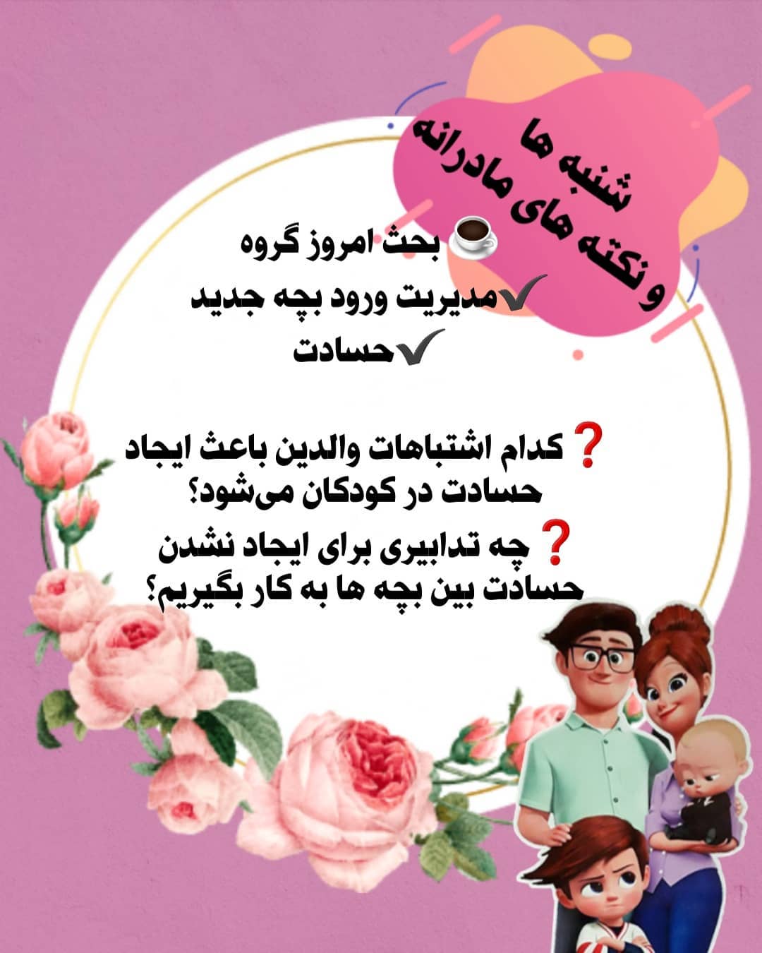 بسم الله #حسادت_بچه_ها #مدیریت_ورود_فرزند_جدید حتما خیلی هاتون یا با این دغدغه مواجه شدید یا در شرفش هستید، در هر صورت این اتفاق یه بازخورد طبیعی در همه بچه ها هست ، نکته مهم نحوه ی مدیریت پدر و مادر و اطرافیان می باشد. ✳ اول بدونید حسادت چرا شکل میگیره؟ به خاطر چشم و هم چشمی، به خاطر تبعیض هایی که پدر و مادر انجام می دهند ، به خاطر اینکه ما به بچه دیگه بیشتر بها داده ایم! ✅ به هیچ وجه از تنبیه و اجبار استفاده نکنید! ✅کودک را نوازش کنید ، بهش محبت کنید به کودک آگاهی بدید، که بخاطر ناتوانی بچه کوچک لازم هست بهش رسیدگی بشه. ✅ با کودکتان حرف بزنید، باهاش بازی کنید، وقتی ببینه بهش توجه میشود ناخوداگاه مشکلش حل میشود. ✅براي آموزش كار خوب ؛ فرزندتان را با ديگران مقايسه نكنید. ✅ توجه اطرافیان باید در روزهای اول معطوف به بچه های قبلی باشد، که خلا نبود مادر کم بشه ✅ اسباب بازی های سرگرم کننده هم در روزهای اول بعد زایمان خیلی کمک کننده هست. ✅ به بچه بزرگتر مسئولیت کارهای بچه کوچیکتر را بدهیم؛ مثلا پوشک بیار کلاه بیار. ✅ برای جلوگیری از اسیب یه سری قوانین داشته باشیم مثلا بالای سر نوزاد نباید ایستاد. بوس فقط از دست و پا ، اینکه نوزادها فاصله ی نزدیک رو نمی بینن و دور رو بهتر میبینن چون کوچولو هستن . ✅حرف زدن محبت امیز با لحن بچه گونه از قول نوزاد به بزرگترها مثلا «خواهرت میگه داداشم رو دوس دارم» شما چه تدابیری به کار گرفتید تا این دوره را پشت سر بگذارید؟؟ آیا خاطره جالبی از آن دوره به یاد دارید؟ #شنبه_های_باشگاه #بحث_گروهی #فرزند_دوم #فرزند_دوم_مادر_آگاه #باشگاه_مادران_تاریخ