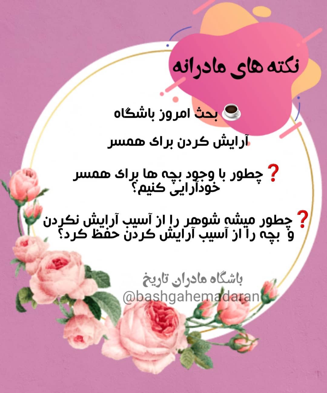 بسم الله 🌱در مورد این مبحث، مسأله ای که وجود دارد این هست که ما معمولا گاهی آرایش میکنیم، برای همین توجه بچه ها جلب میشود. 🌱اما اگر مثل لباس مرتب پوشیدن و عطر زدن جزو برنامه های روزانه مون باشد ، براشون طبیعی میشود. 🌱 رنگ رژ لب و وجود یا عدم وجود رژگونه ، میتواند تنوع نامحسوس برای همسر باشد. آرایش آنچنانی هم برای زمان های خاص و بستگی به سلیقه ی همسر دارد. میتوان ارایش های غلیظ و خاص تر را بعد از خواب بچه ها قرار داد. ممکن هست زمان بهره ی بصری همسر، دقایقی بیشتر نشود اما همین که همسر متوجه این وقت گذاشتن میشود ارزش دارد. 🌱در مورد لاک زدن، میشود هر وقت لاک زدیم ، موقع اذان و موقع بیرون رفتن، جلوی چشم بچه ها پاک کنیم که بچه ها متوجه قواعد بشوند. 🌱اگر دختر بچه ها متوجه قواعد درست استفاده از لوازم آرایش باشند (مقدار ، زمان ، حدود) می تواند مناسب باشد. 🌱اما اگر رغبت بیش از حد وجود داشته باشد و با رفتار ما و صحبت های غیر مستقیم ما کم نشود، شاید لازمه باشد با مشاور مشورت کنیم درست مثل هر چیزی که ممکن هست زیاده رویش بد باشد. 🌱حتی دختردار هایی که دخترانی علاقه مند دارن میتوانند، ساعتهایی رو بدون حضور مردهای خونه، برای خودشون اختصاص بدهند و آرایش کنند. حتی دخترها مامان شون رو آرایش کنن و نقاشی های جالب بکشن! 😅😅 ✅گزیده ای از بحث امروز در باشگاه مادران تاریخ 🦋ادامه این بحث جالب را در کانال آرشیو باشگاه مادران میتوانید دنبال کنید.. #بحث_گروهی #یکشنبه_های_باشگاه #آرایش #آرایش_کردن #آراستگی #باشگاه_مادران_تاریخ