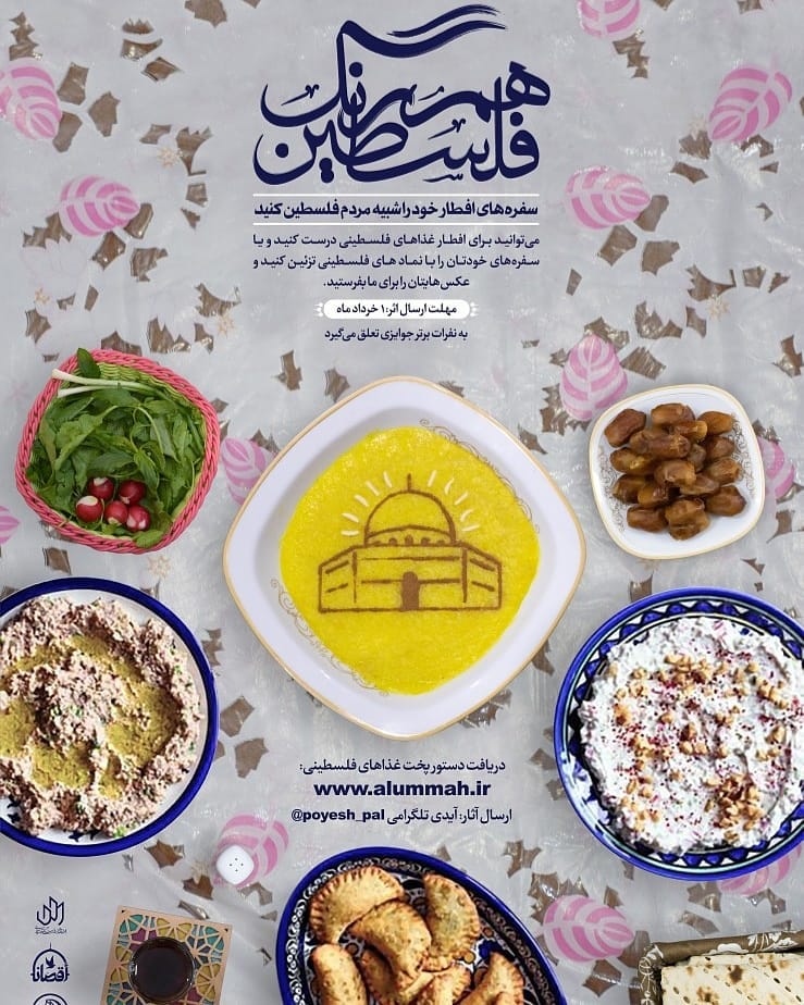 💢 پویش #هم_رنگ_فلسطین 🥙 سفرههای افطار خود را شبیه مردم فلسطین کنید🥘 🔸میتوانید برای افطار #غذا_های_فلسطینی درست کنید و یا سفرههای خودتان را با نماد های فلسطینی تزئین کنید و عکسهایتان را برای ما بفرستید. ⏰ مهلت ارسال اثر: یک خرداد ماه 🎁 به نفرات برتر جوایزی تعلق میگیرد. 📲 ارسال آثار: آیدی تلگرامی @poyesh_pal