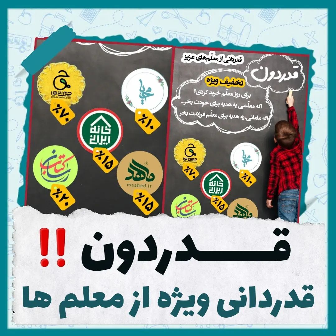 خبر خبر خبرمهم‼️کپشن رو تا آخر بخون و این فرصت فوق العاده رو از دست نده ⬇️😎🤯 . میدونی که روز معلم نزدیکه؟ 🤔 برای روز معلم خرید کردی⁉️ بدو بیا که یه برنامه ویژه داریم مخصوص خودت😇👇🏻 . اگه معلمی یه هدیه برای خودت بخر👩🏻🏫👨🏻🏫 اگه مامان یا بابا هستی، یه هدیه برای معلم فرزندت بخر🤗 حالا چه جوری!؟ . به مناسبت روز معلم، میتونی تا ۱۵ اردیبهشت، با کد تخفیف moalem01 از فروشگاه های عالی زیر خرید کنی🤩👇🏻 🔷محصولات سبک زندگی و مذهبی ماهد: @maahed.ir 🔷کتاب رسان مخصوص کتابخون ها: @ketabresan_net2 🔷مانتو نوجوان و بزرگسال محیا: @mahya.poosh 🔷محصولات خانواده خانه ی ایرانی: @khaneh_irani 🔷محصولات و دفترهای اردی بهشت: @ordybehesht_group . ✅رااااستی میتونی تمام کارگاه ها و دوره های آموزشی و تربیتی ما رو هم با ۷٠٪ تخفیف تکرار نشدنی از فروشگاه چمرانی ها(آدرس در بایوی صفحه) تهیه کنی😊😳 . ‼️این پست رو ذخیره کن تا یادت نره از تخفیف استفاده کنی و والدین و معلم ها هم همینجا تگ کن که از تخفیف ویژه ما استفاده کنند😎 . #قدردانی #روز_معلم#هدیه#خانواده #معلم#هدیه_روز_معلم #معلم_ایرانی #تربیت_فرزند #تخفیف_ویژه #خانه_ایرانی#ماهد#کتابرسان #چمران_فقط_یک_مدرسه_نیست